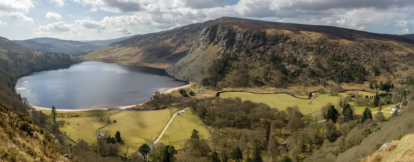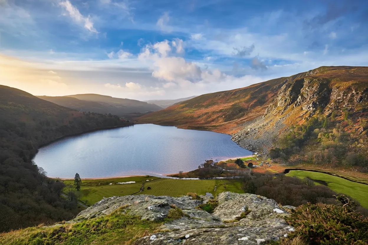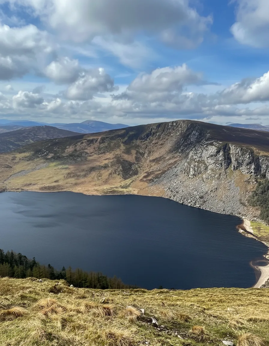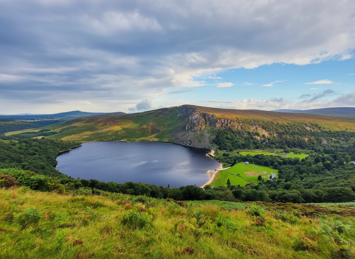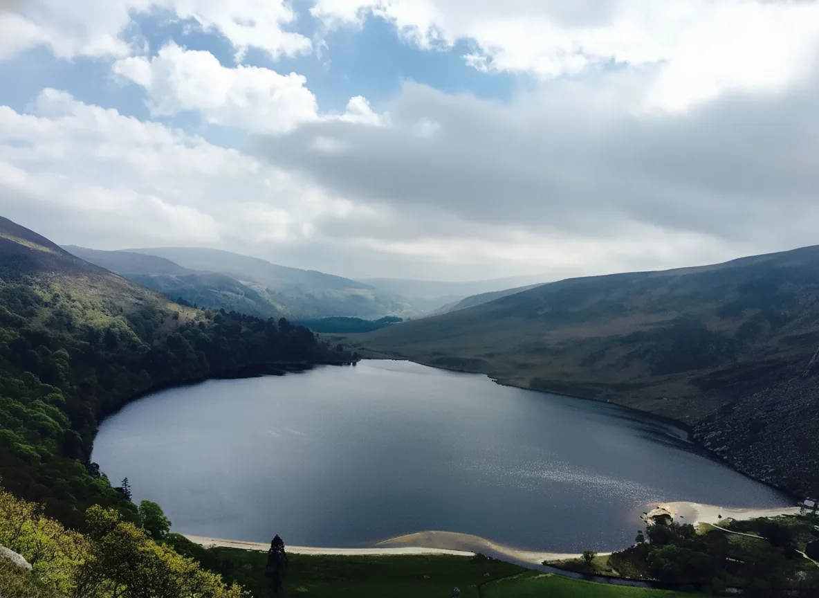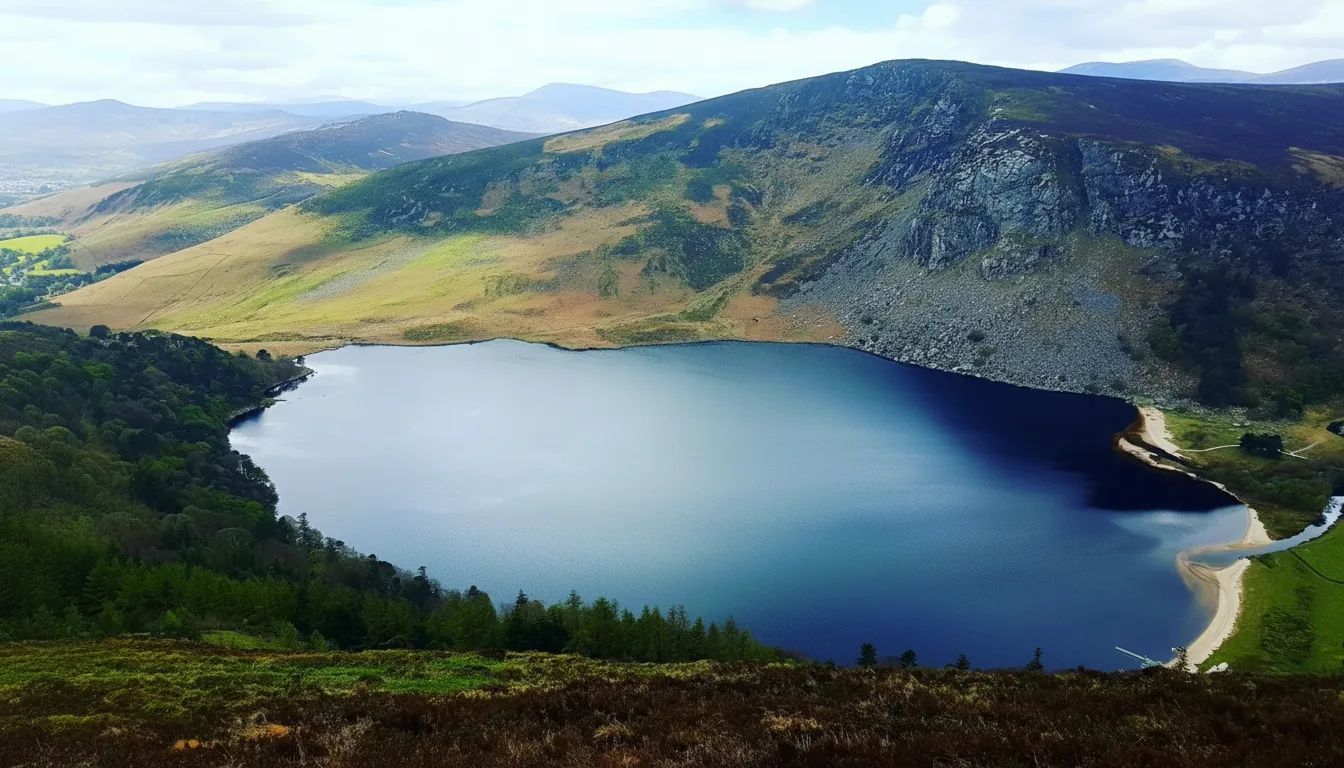 Lough Tay is a striking mountain lake located within the Wicklow Mountains National Park in County Wicklow, Ireland. Surrounded by steep hillsides, the lake is known for its dark waters and dramatic setting. It is often referred to as one of the most photographed lakes in the Wicklow region. The lake sits in a remote valley and is best viewed from nearby viewpoints along the mountain roads. Although direct access to the lakeshore is limited, the elevated views provide an impressive perspective of the landscape.