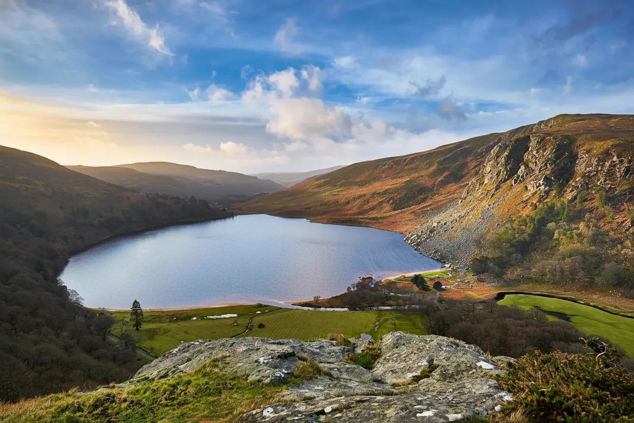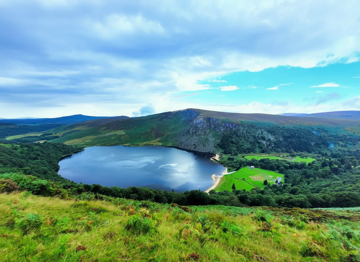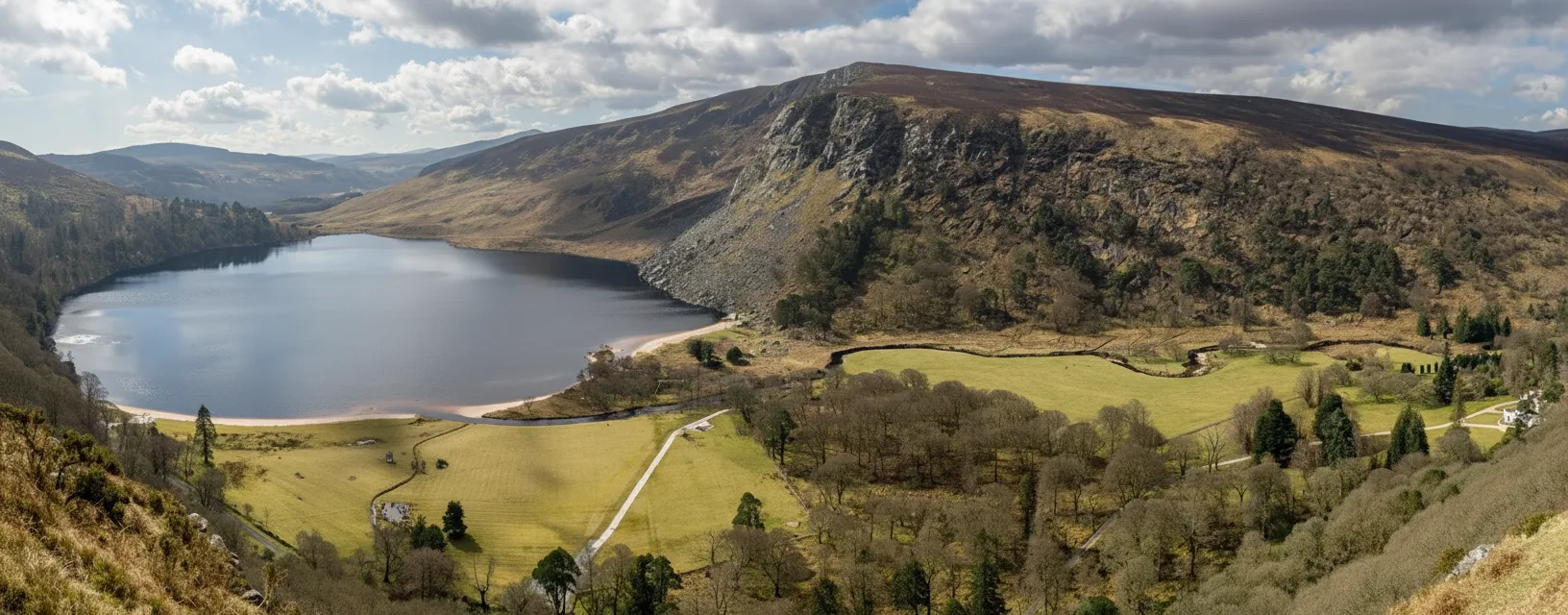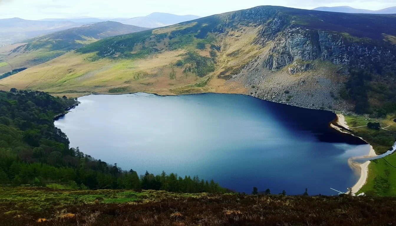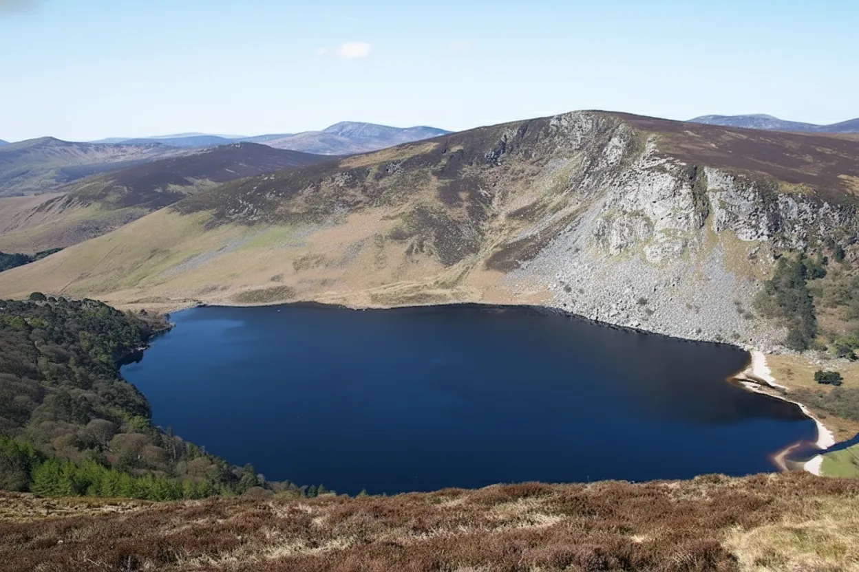 Lough Tay, often called the Guinness Lake, is a striking mountain lake set deep within the Wicklow Mountains. The lake is surrounded by steep hillsides and dark waters that create a dramatic and memorable landscape. The viewpoint above the lake is one of the most photographed spots in Wicklow. Visitors usually admire Lough Tay from designated viewing areas along the mountain road. For travelers, Lough Tay offers a short but rewarding stop to experience Wicklow’s rugged beauty and iconic scenery.