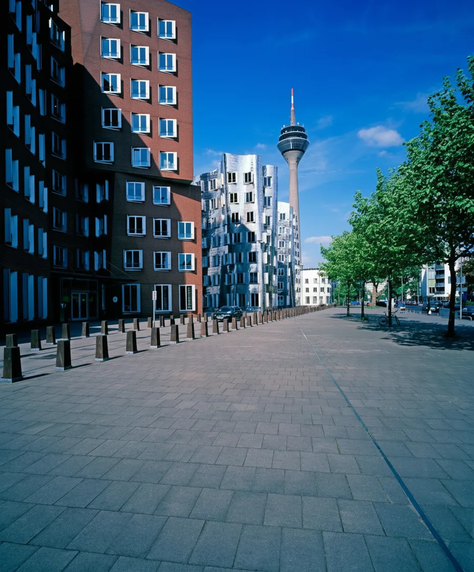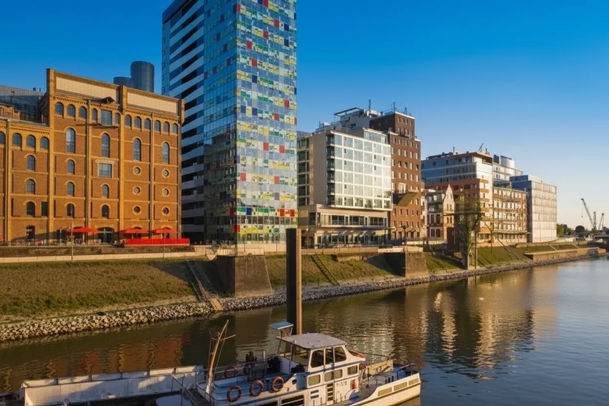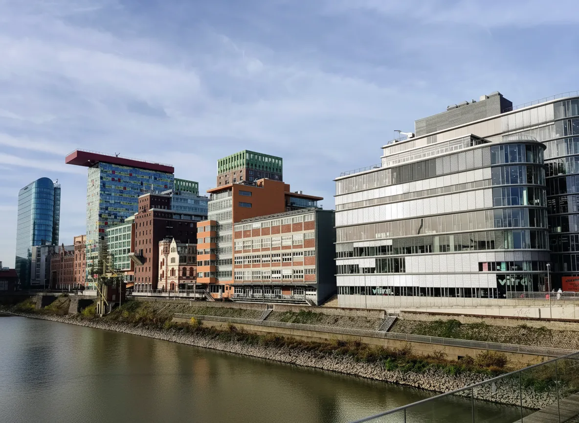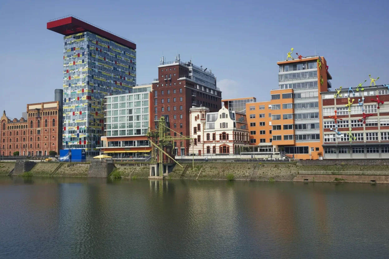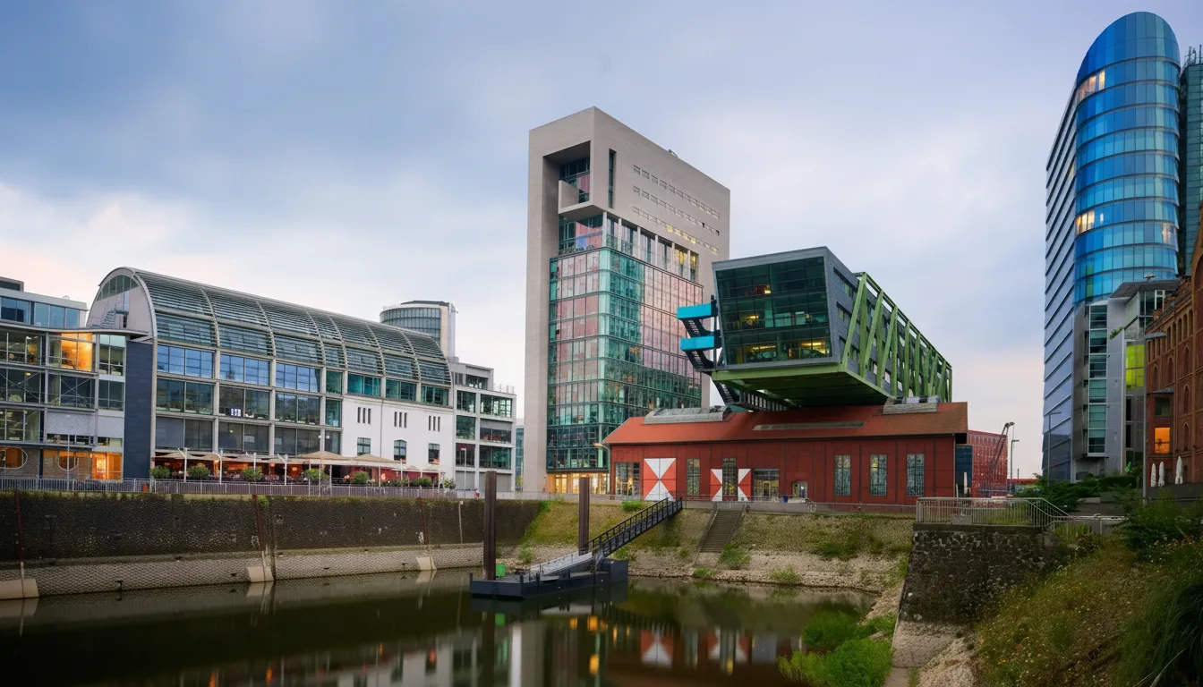 MedienHafen is Düsseldorf’s modern harbor district, known for striking contemporary architecture, designed by world-renowned architects, and its vibrant waterfront atmosphere. Once an industrial port, it has transformed into a lively area with offices, restaurants, and scenic river views.