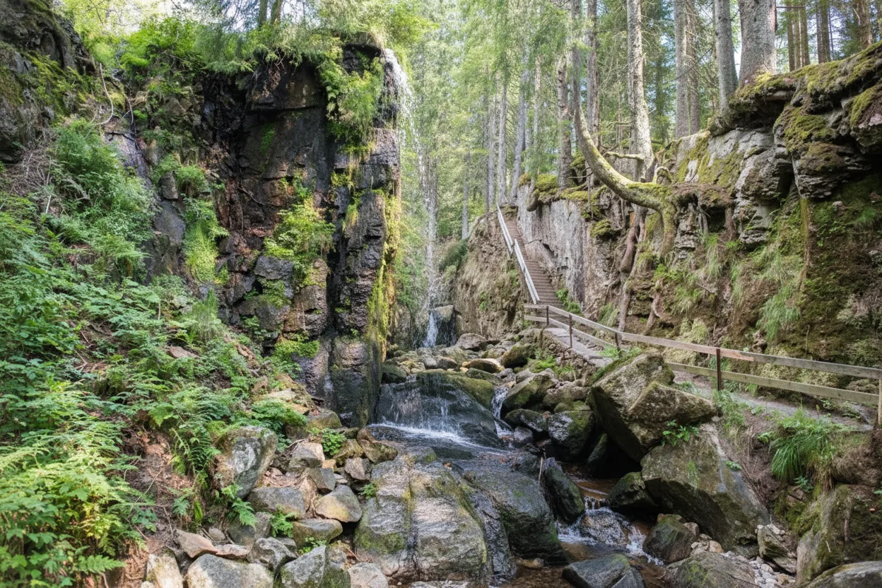 Menzenschwand Waterfall is a peaceful forest waterfall located in the southern Black Forest. Surrounded by tall trees, narrow walking paths, and quiet natural spaces, it is perfect for travelers seeking a gentle hike and beautiful nature scenery