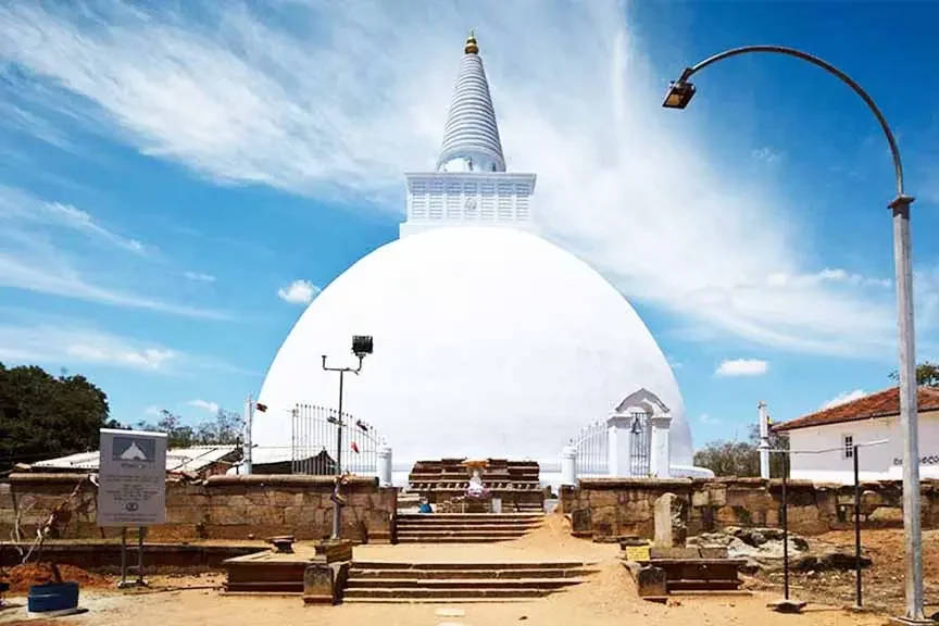 The Mirisawetiya Stupa, one of the oldest and most respected monuments in Anuradhapura, was built by King Dutugemunu in the 2nd century BC. It stands among the four great stupas of the Sacred City and symbolizes the unity and devotion of the ancient Sinhala kingdom. Legend says King Dutugemunu built this stupa as a form of repentance after forgetting to offer miris (chili) to the monks before his meal — a reminder of humility and respect in Buddhist tradition. Today, the brilliant white dome surrounded by calm gardens offers both spiritual peace and architectural beauty to visitors.