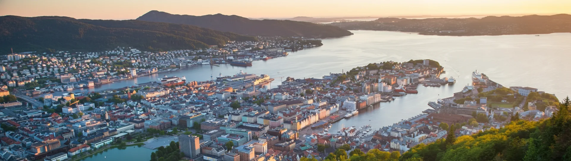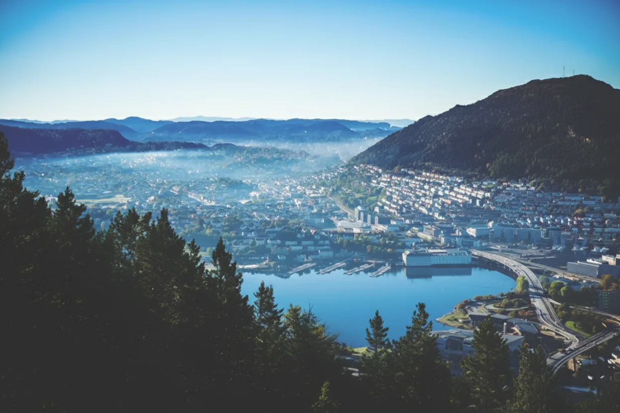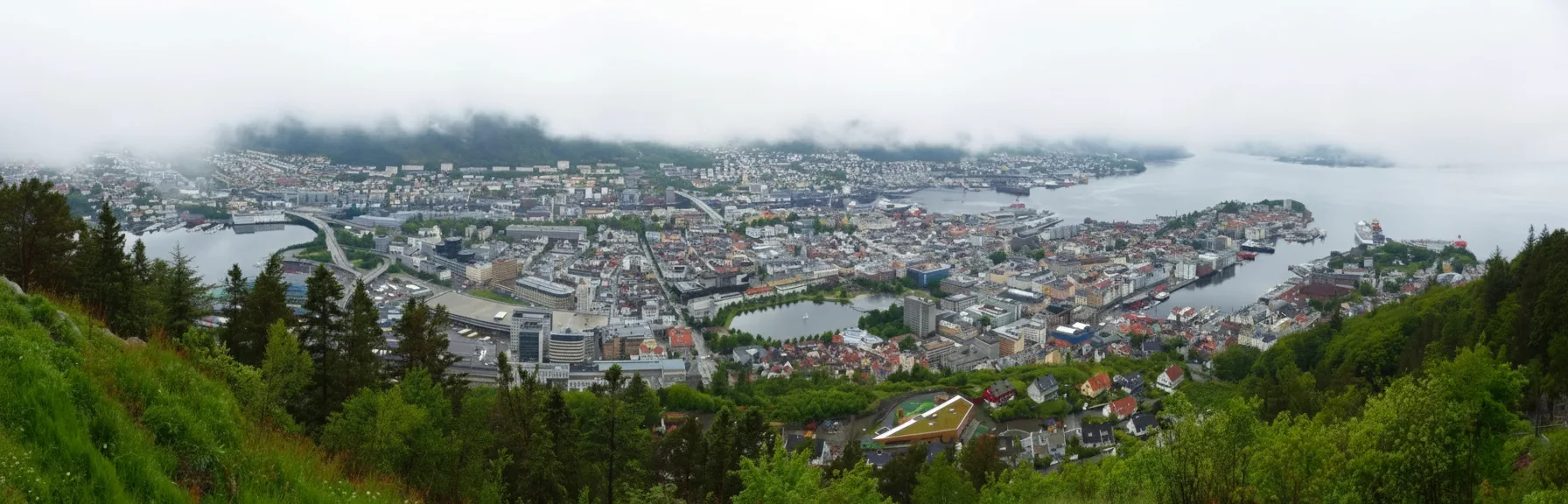 panoramic views over the city, harbor, and surrounding fjords. Rising just above the city center, it is a