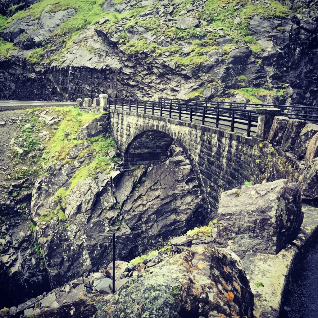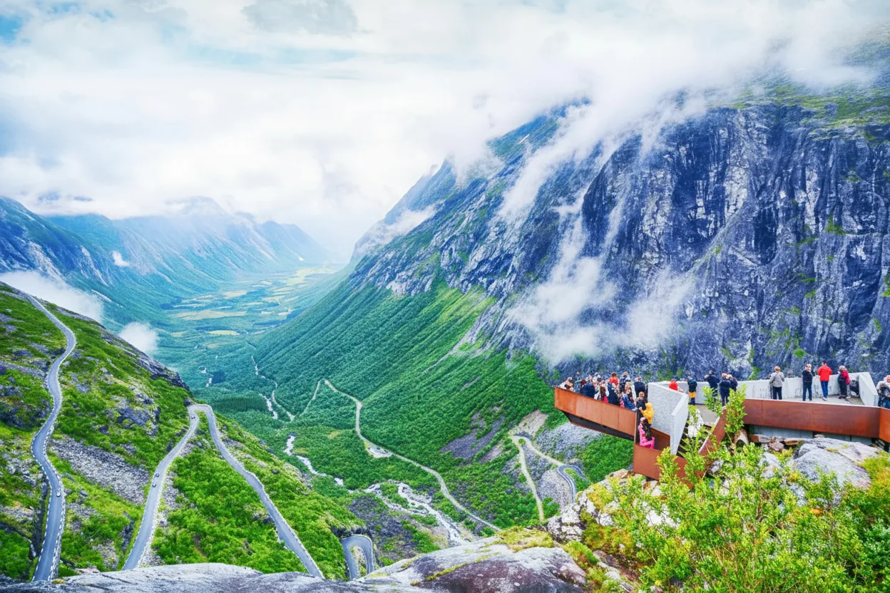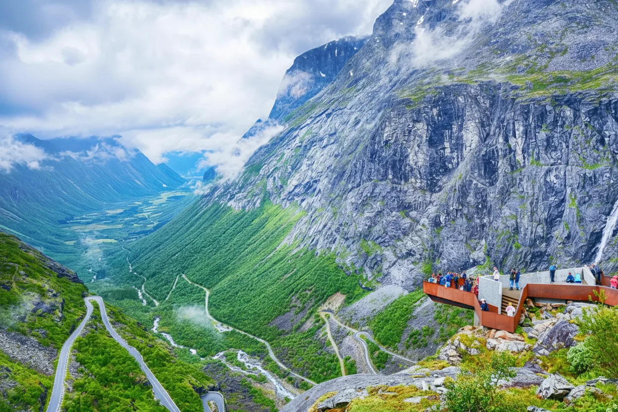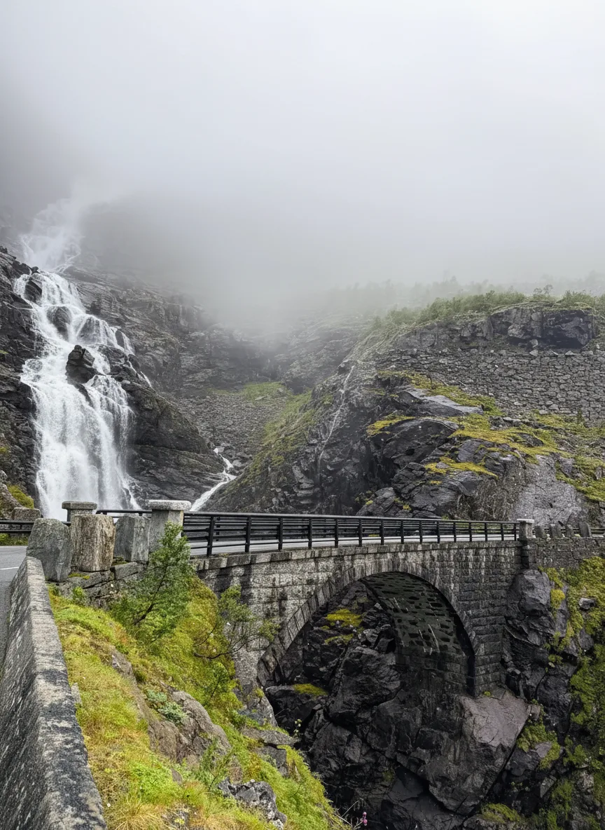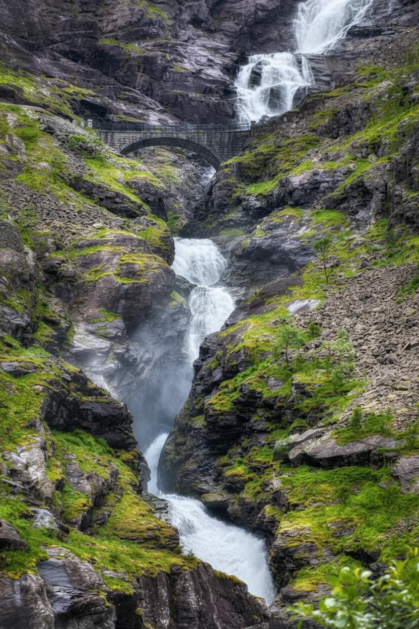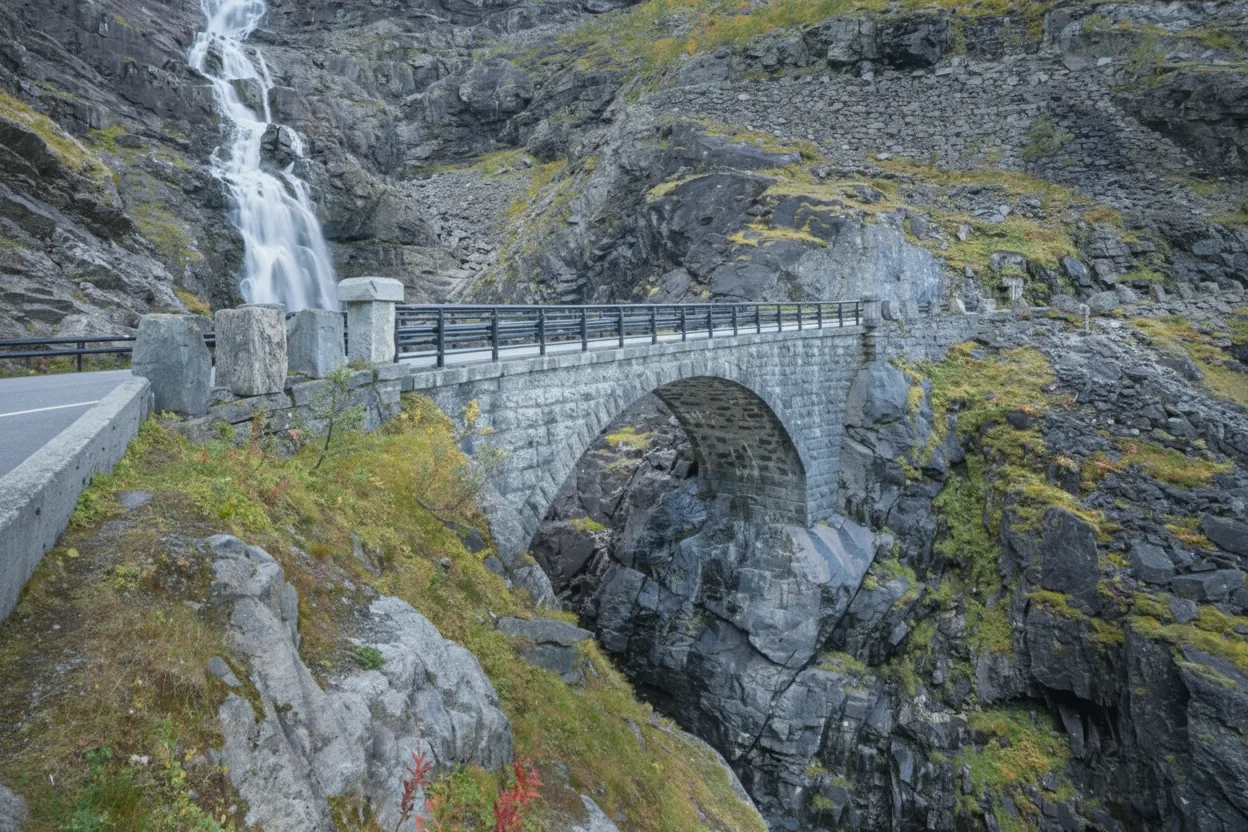 The Mountain Bridge at Trollstigen is an iconic architectural structure built over the powerful Stigfossen Waterfall. This dramatic stone and concrete bridge allows travelers to experience the full force of the waterfall while providing safe passage along the steep mountain road.