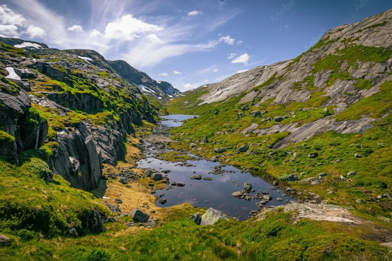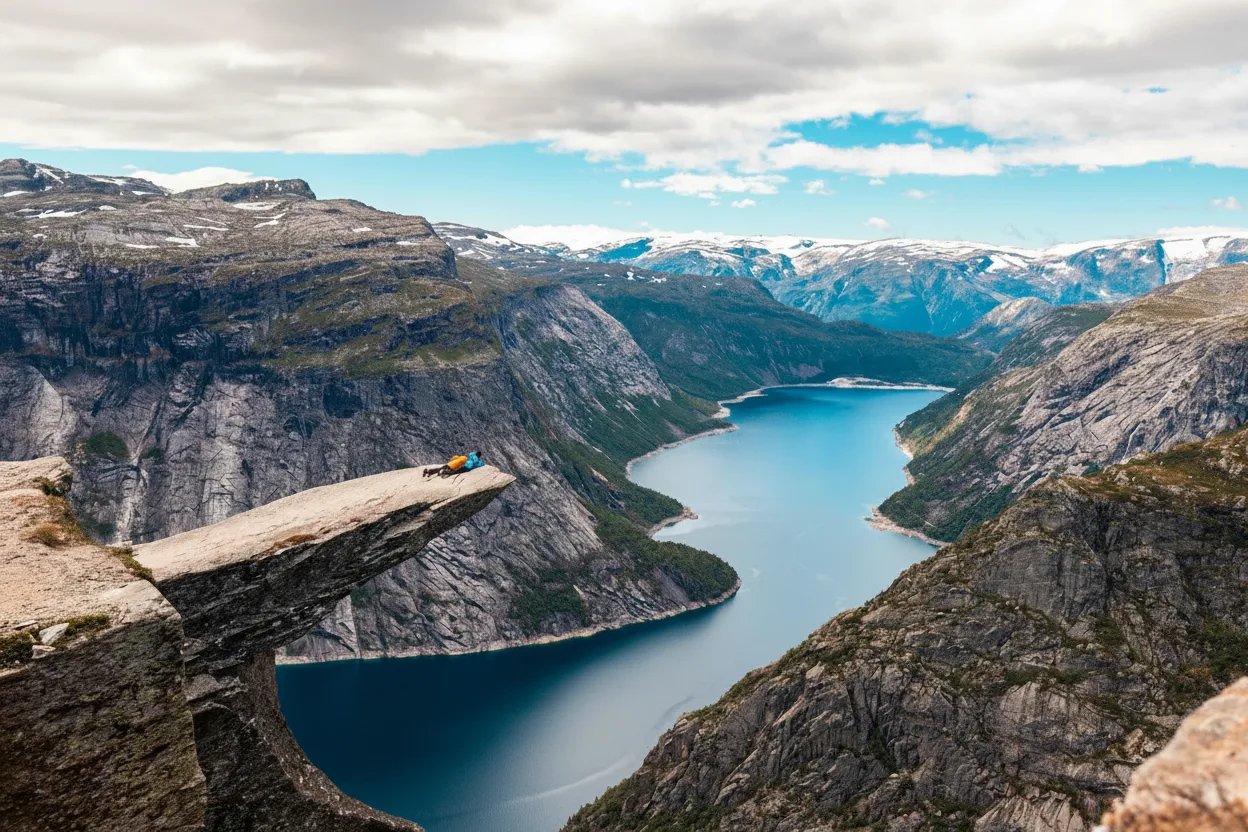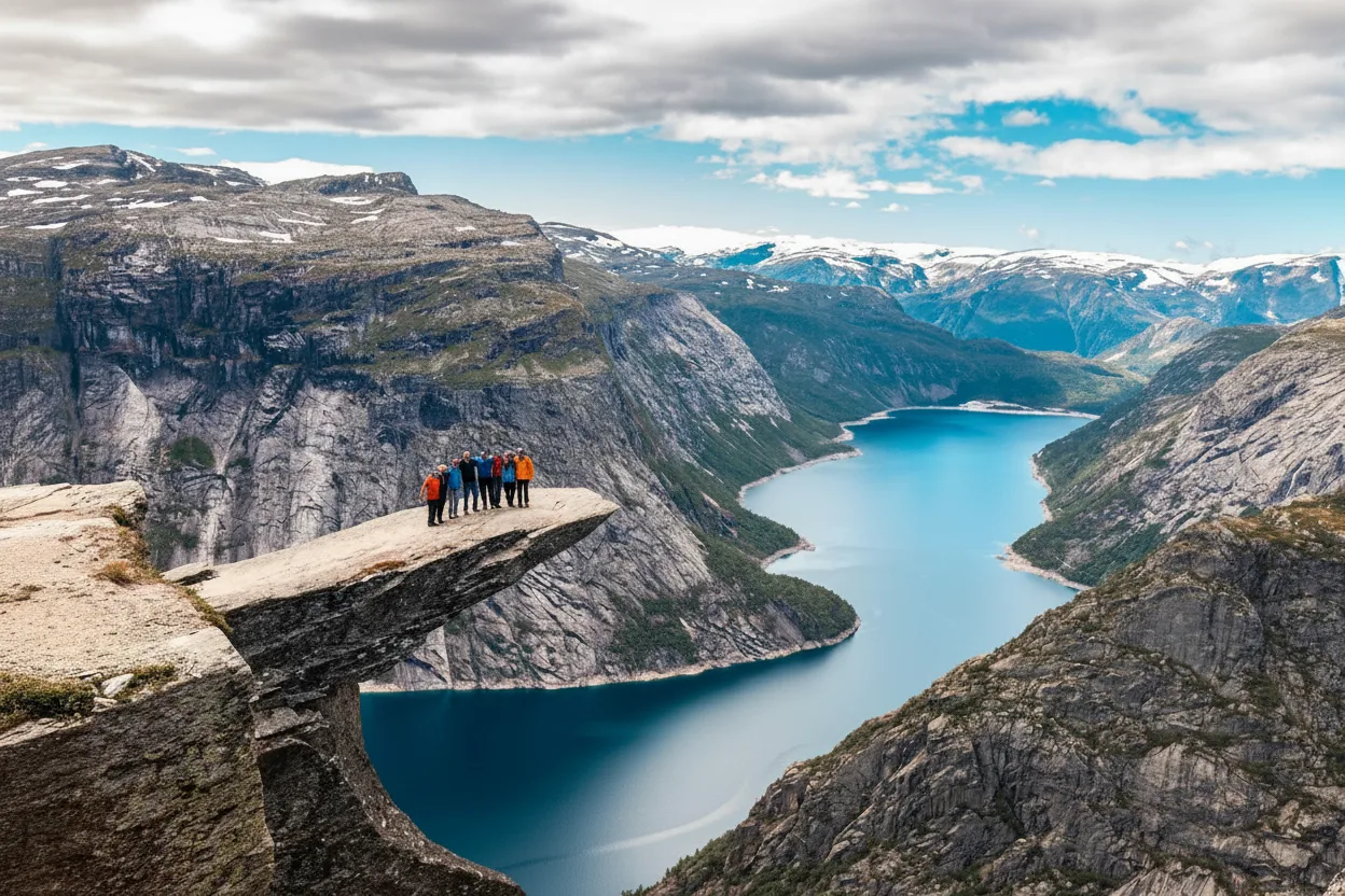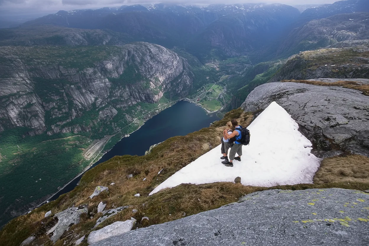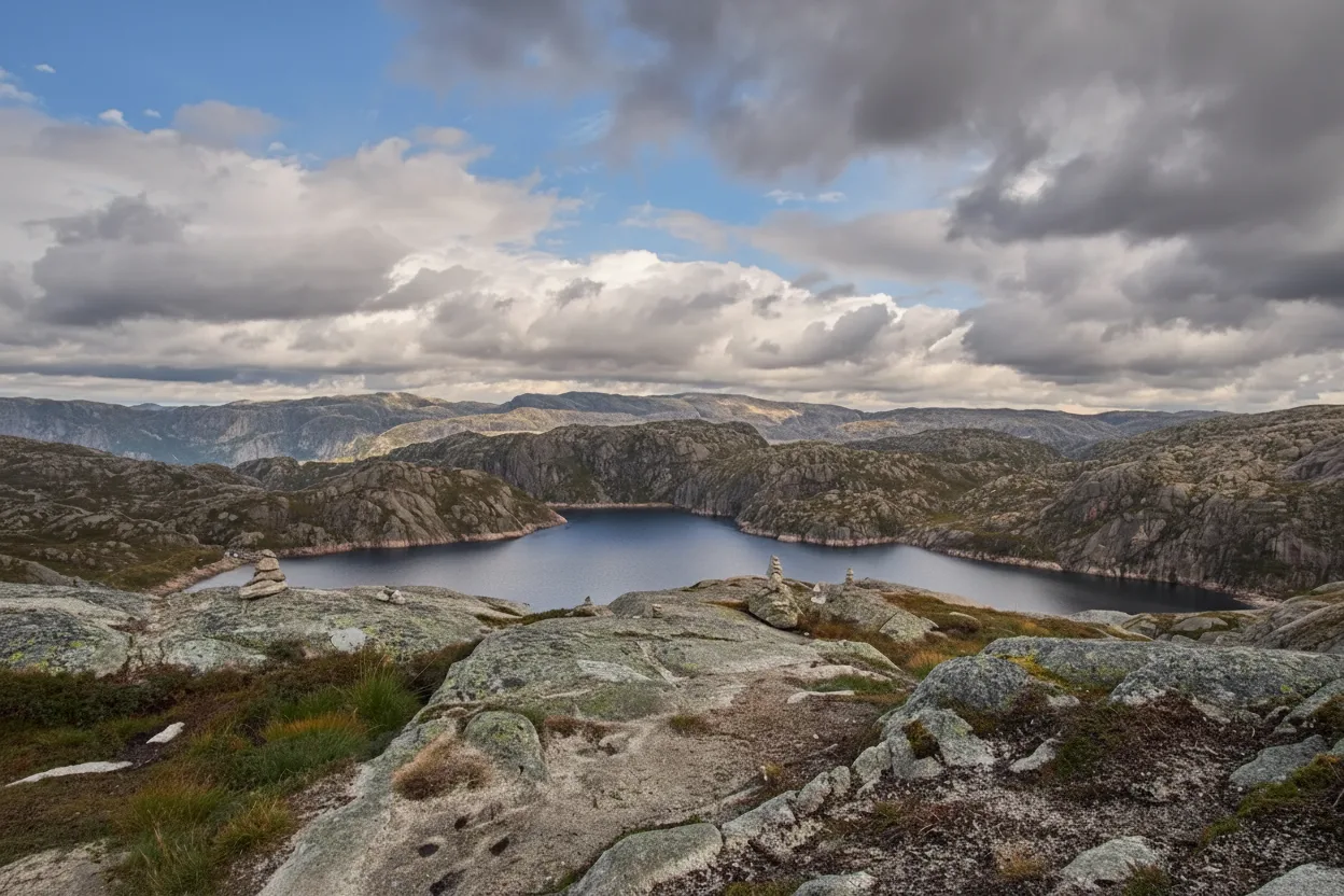 Mountain lakes near the Kjerag plateau are small, calm bodies of water formed by snowmelt and natural rock basins. Surrounded by open mountain terrain, these lakes reflect the sky and surrounding cliffs during calm weather. The lakes add contrast to the rugged landscape and offer quiet moments during long hikes. They are not developed swimming areas but provide scenic rest points and photography opportunities. For hikers, mountain lakes near Kjerag create peaceful highlights within a demanding alpine environment.