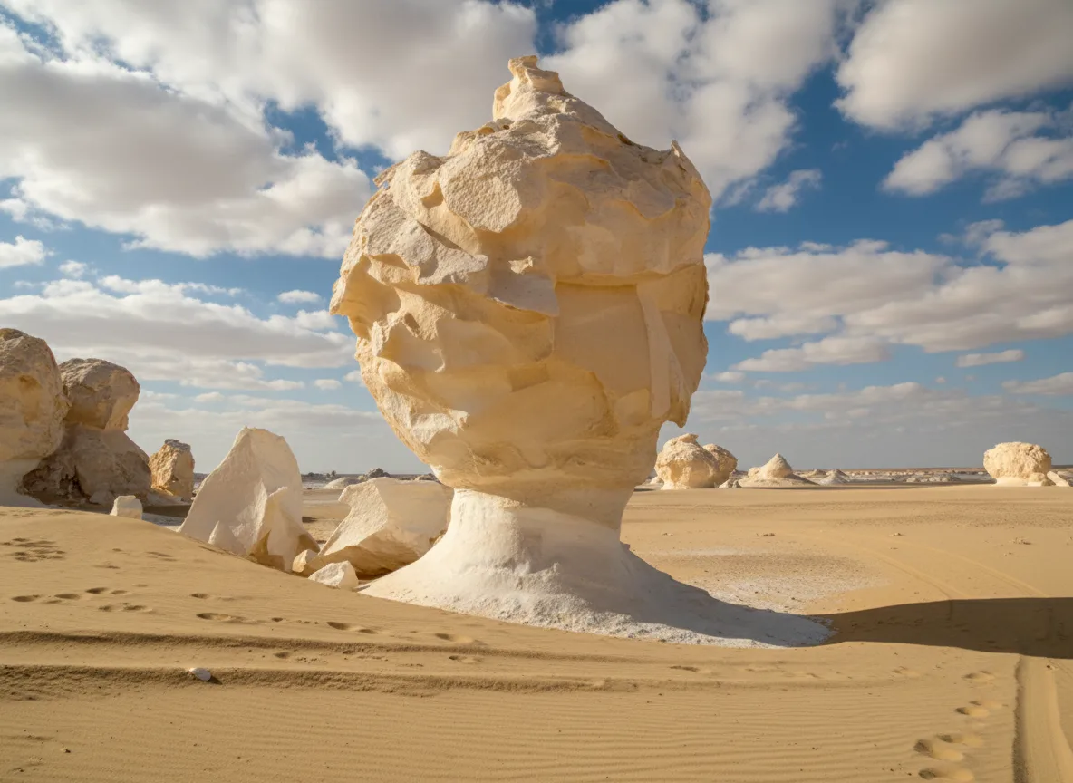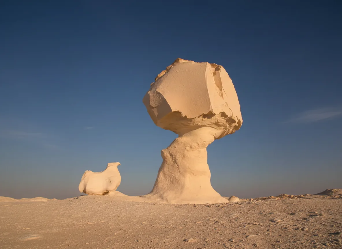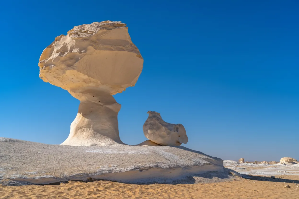 Mushroom Rock is one of the most recognizable formations in Egypt’s White Desert National Park. Its narrow base and wide top resemble a giant mushroom, shaped naturally by centuries of wind erosion. This formation highlights the power of desert winds and changing climate conditions. It is a popular stop for visitors due to its unique shape and striking contrast with the white desert floor.