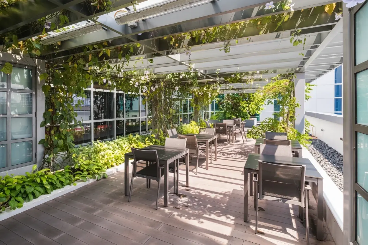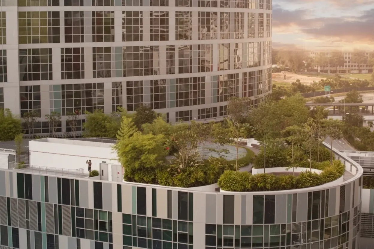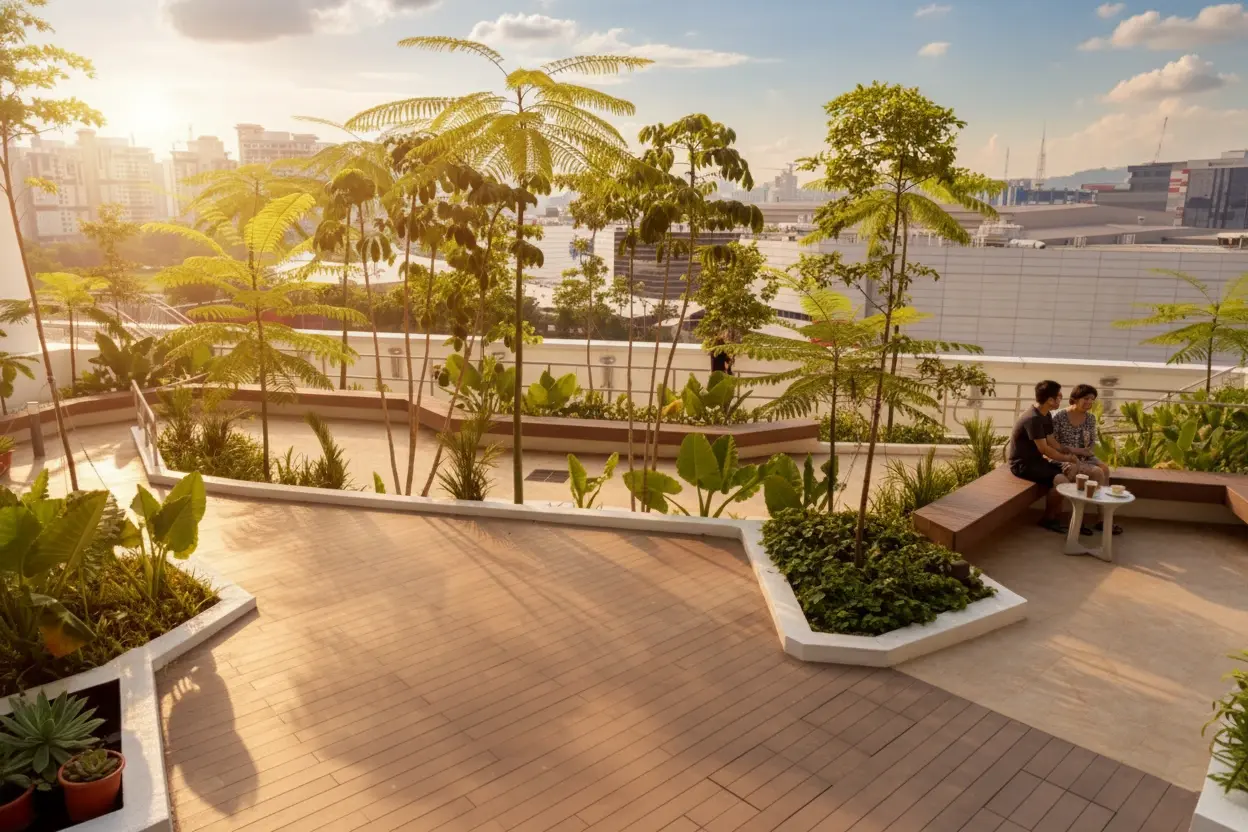 rooftop garden combines lush greenery, city views, and peaceful walking paths. It’s an ideal place