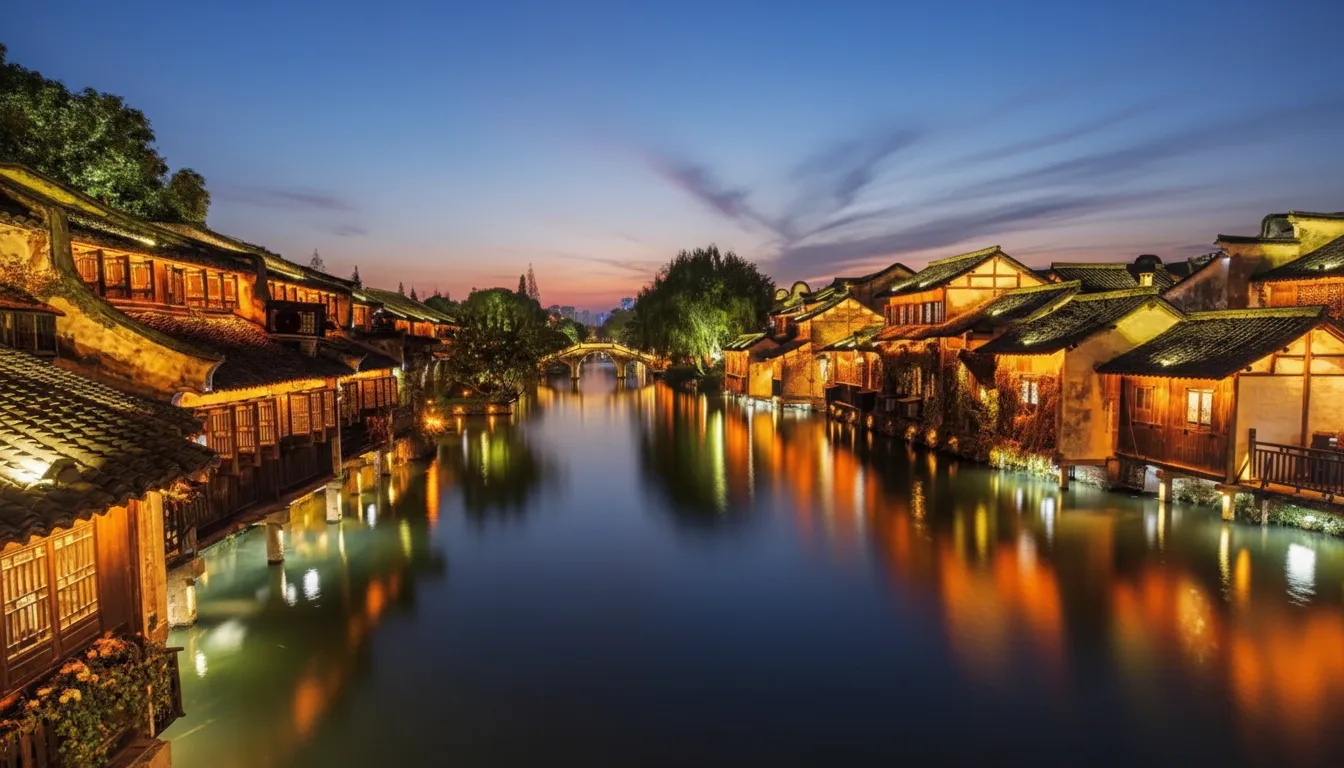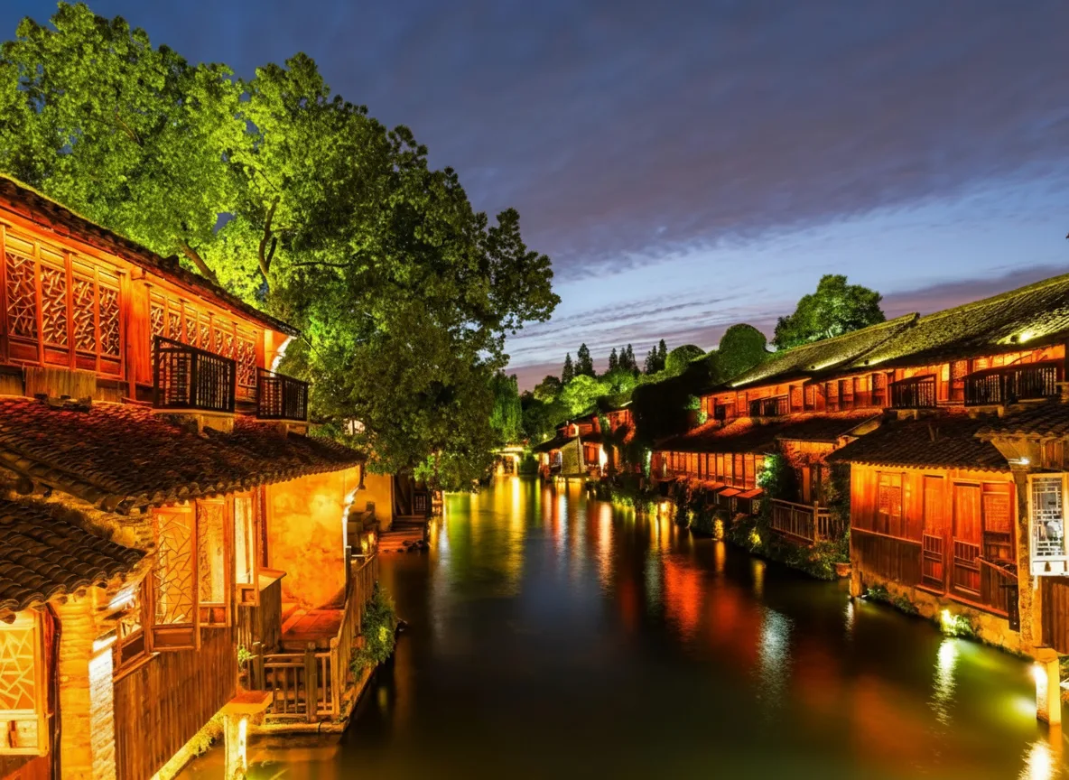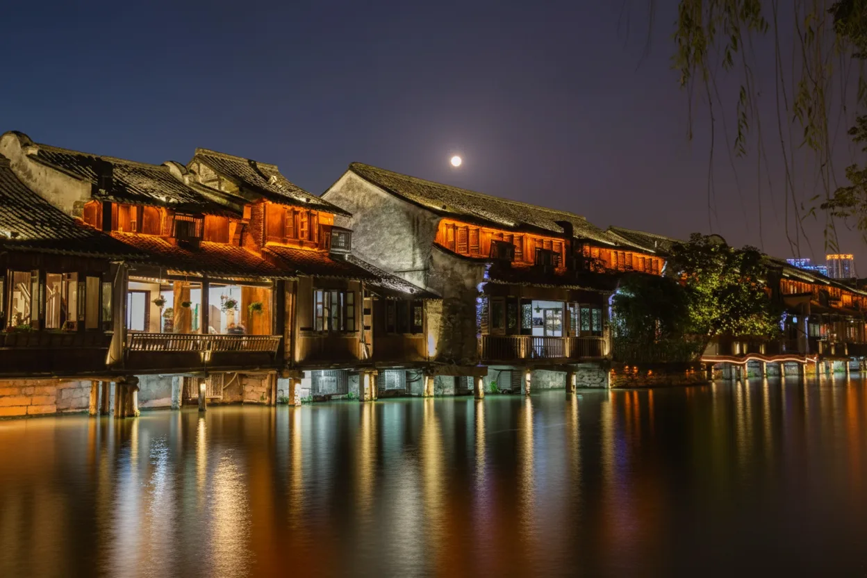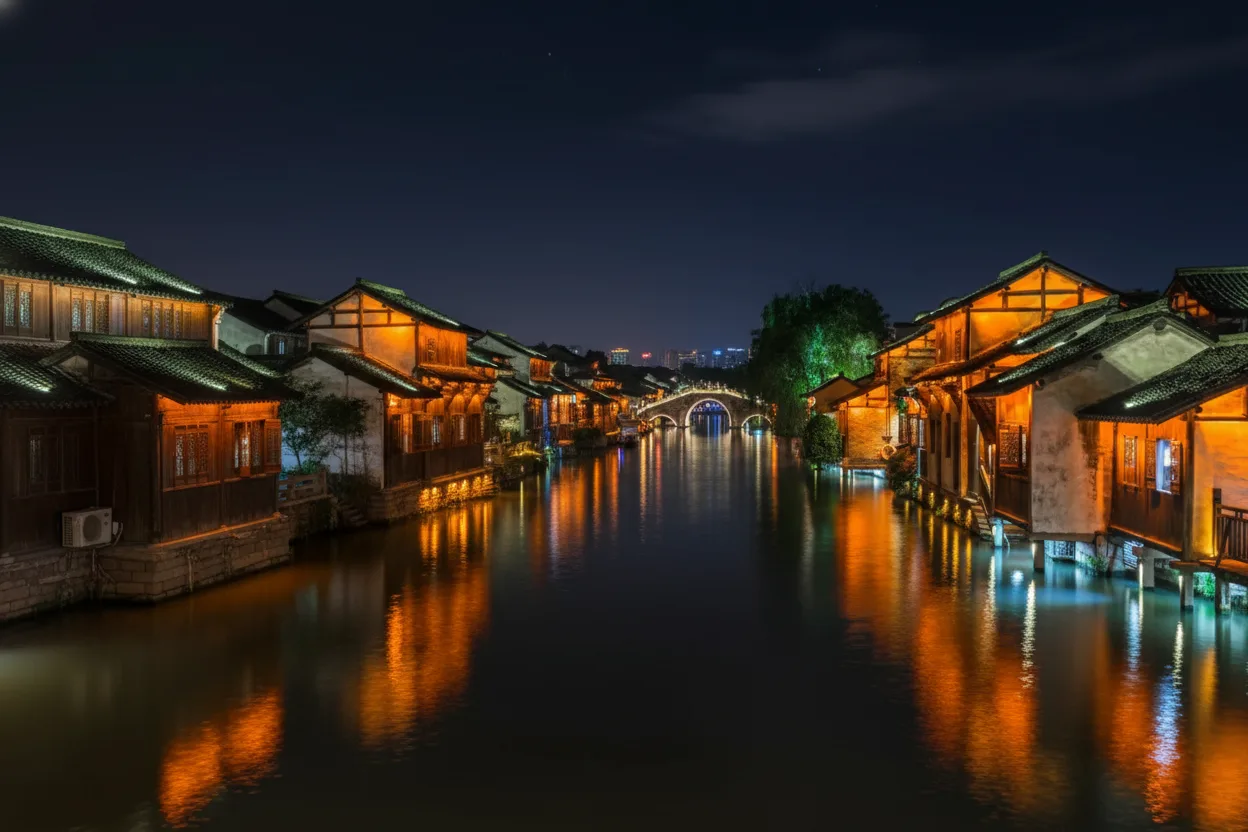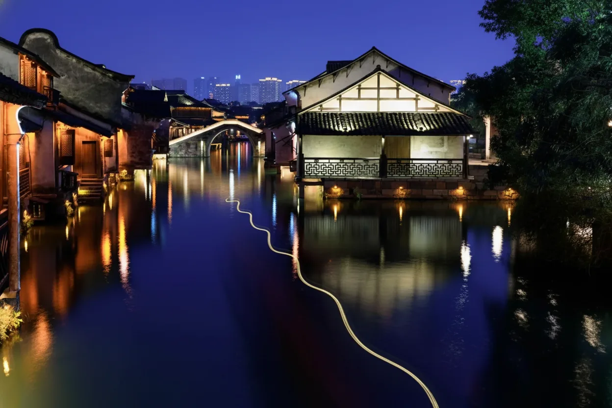 As night falls in Wuzhen, the water town transforms into a calm and atmospheric