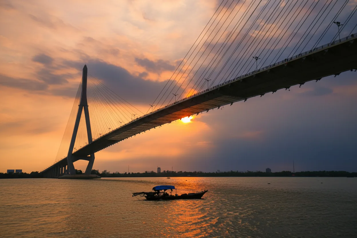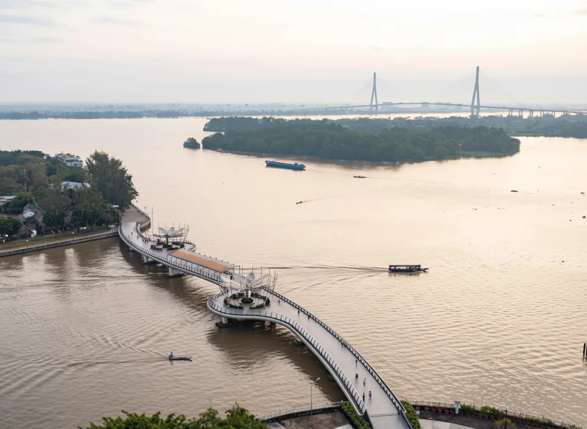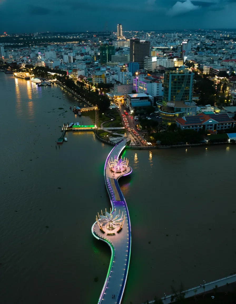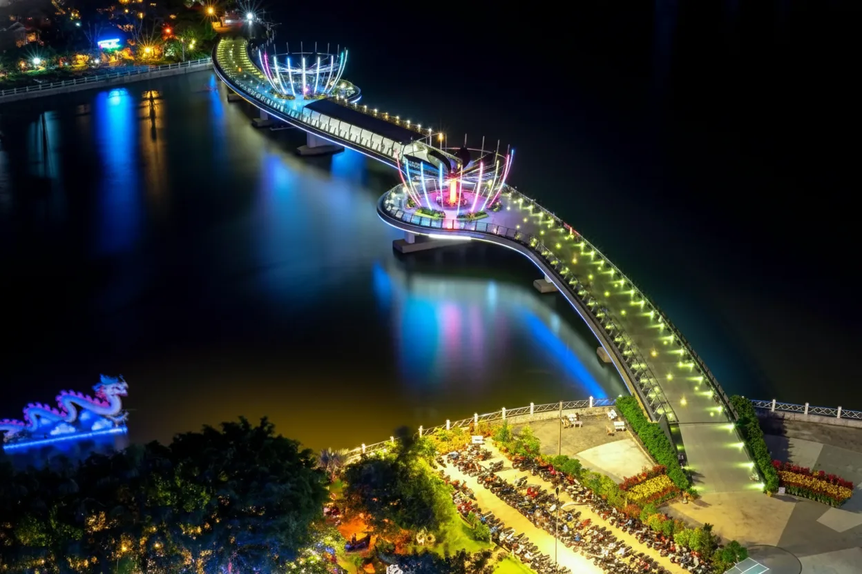 Ninh Kiều Pedestrian Bridge is a modern landmark in Cần Thơ, connecting riverside areas while offering open views of the Hậu River. The bridge is especially popular in the evening when colorful lights reflect on the water and create a vibrant atmosphere. It is a favorite walking spot for locals and travelers who want panoramic river scenery and relaxing night views.