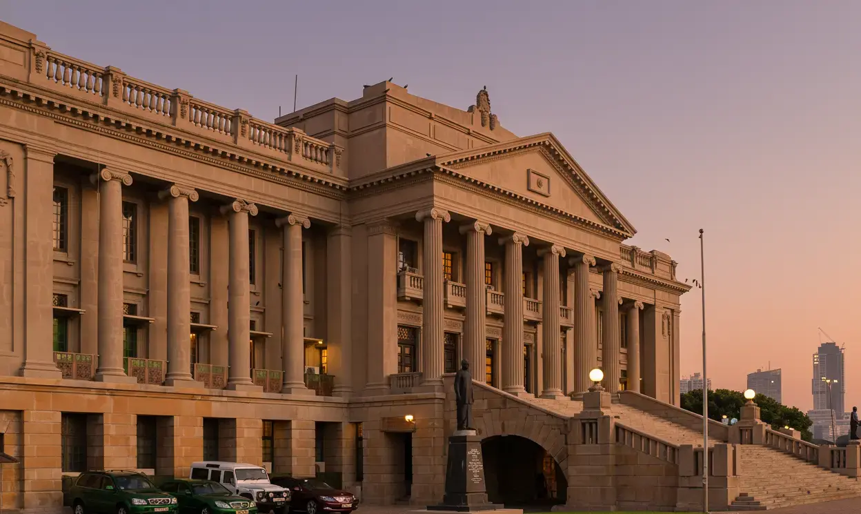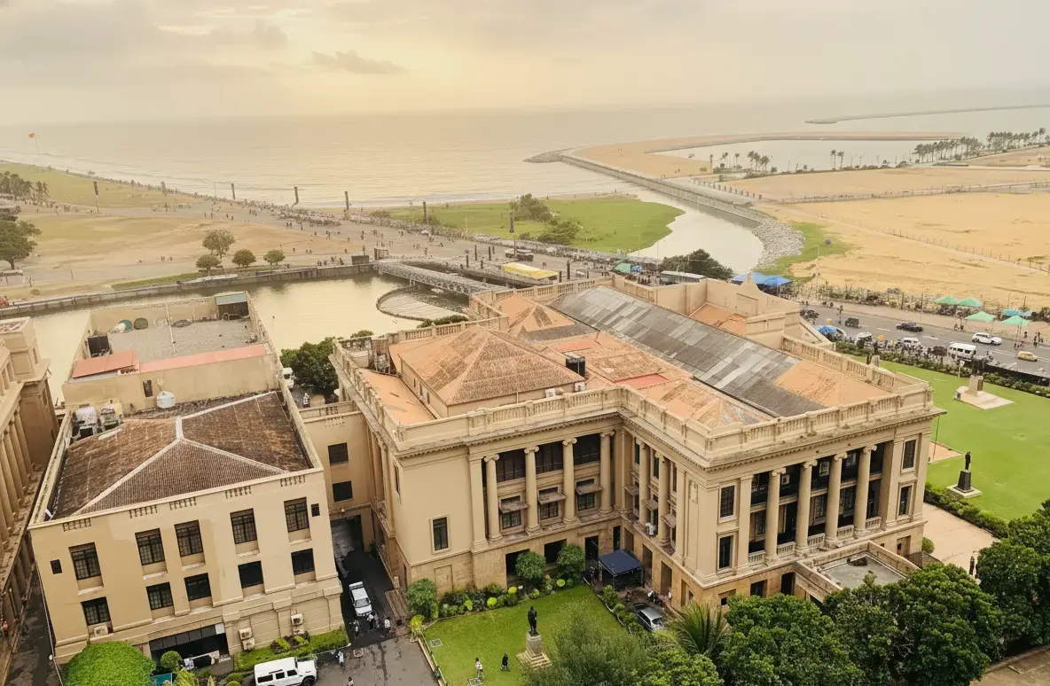 Built in 1930 during British rule, the building showcases neoclassical architecture with towering columns and a stately façade overlooking the Indian Ocean.