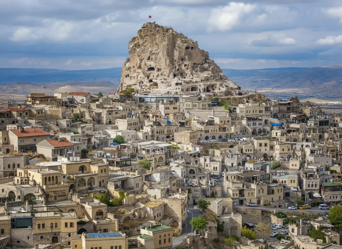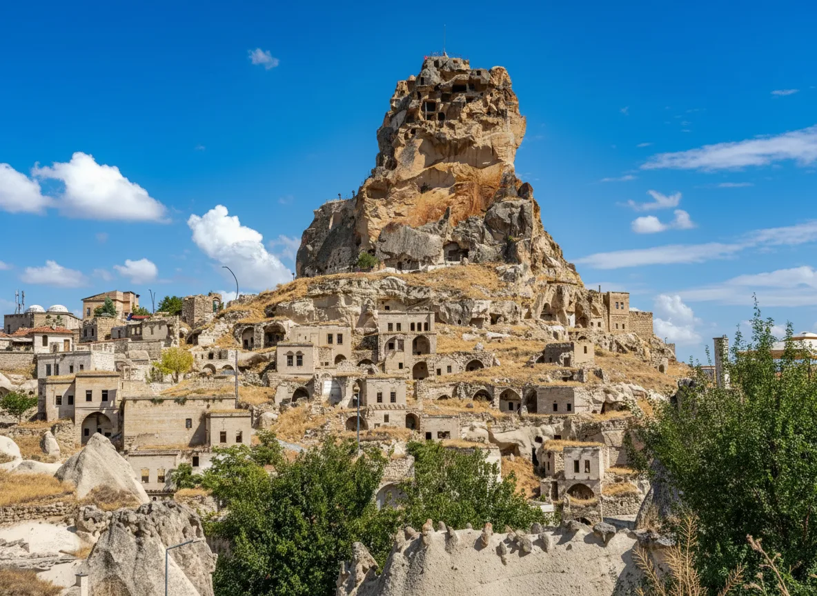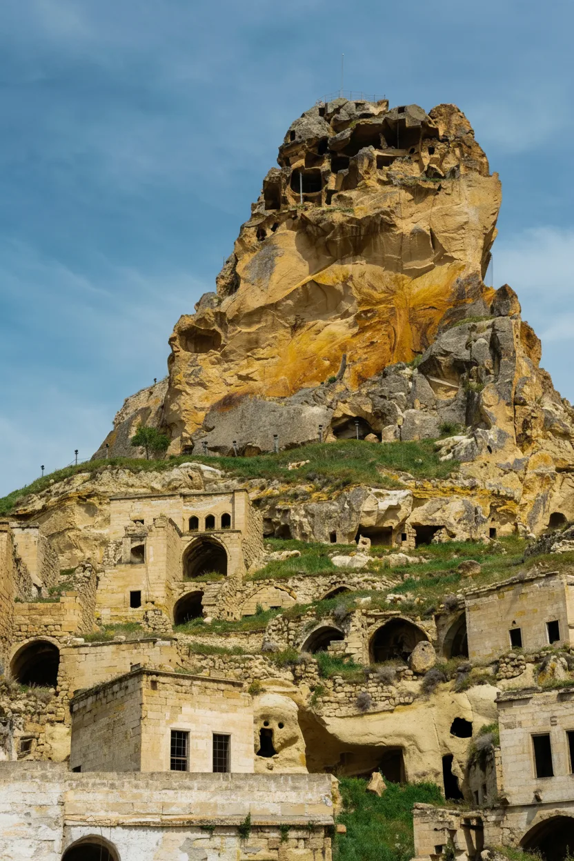 Ortahisar Castle is a striking rock fortress located in the village of Ortahisar in Cappadocia, Turkey. Rising above the surrounding houses, the castle offers impressive views of nearby valleys, fairy chimneys, and Mount Erciyes in the distance on clear days. It is a quieter alternative to Uchisar Castle.