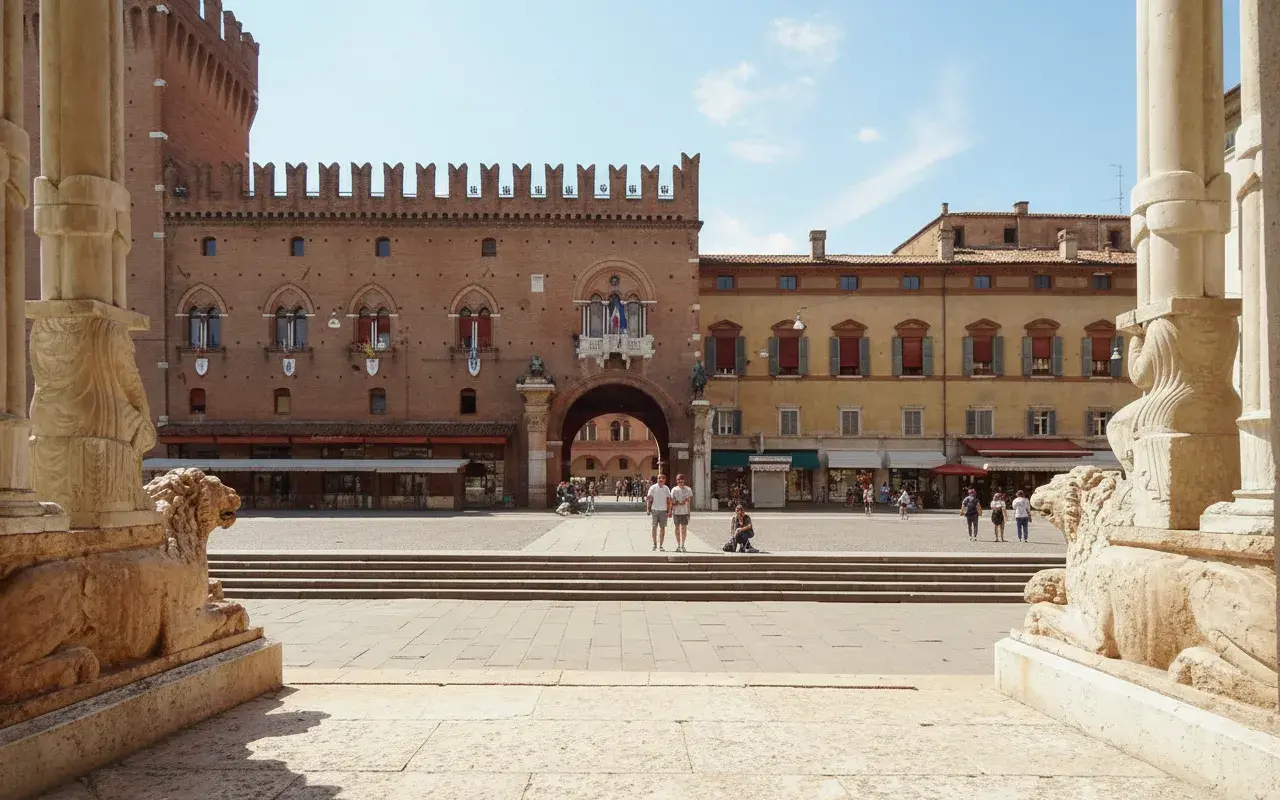 • View the bronze statues 🗿 of Niccolò III d’Este 🤴 and his son Borso above the main gate 🛡️👑