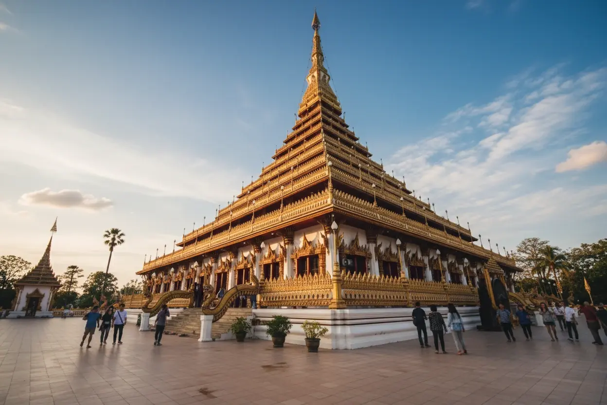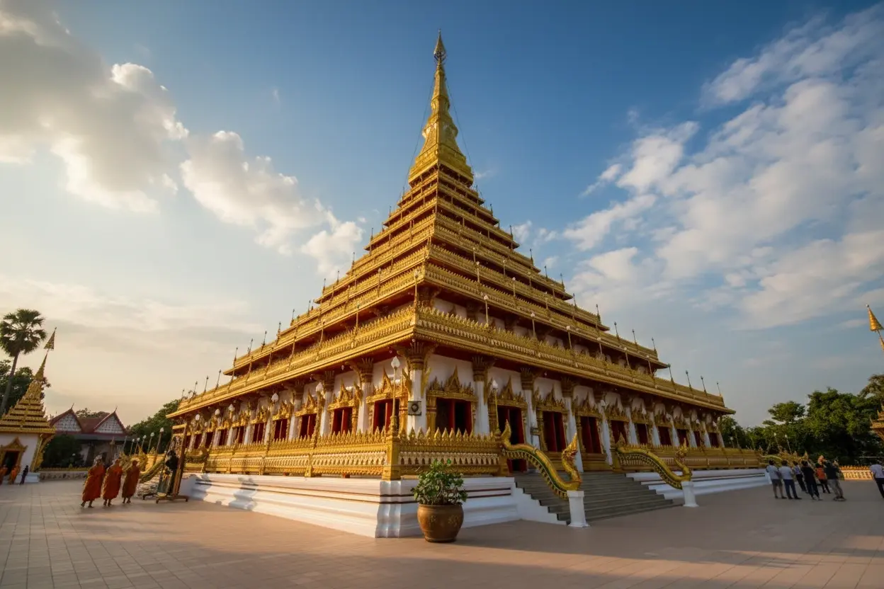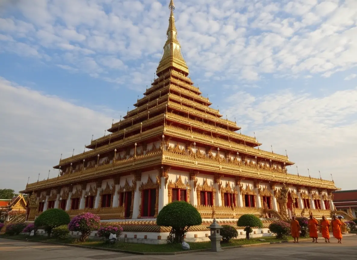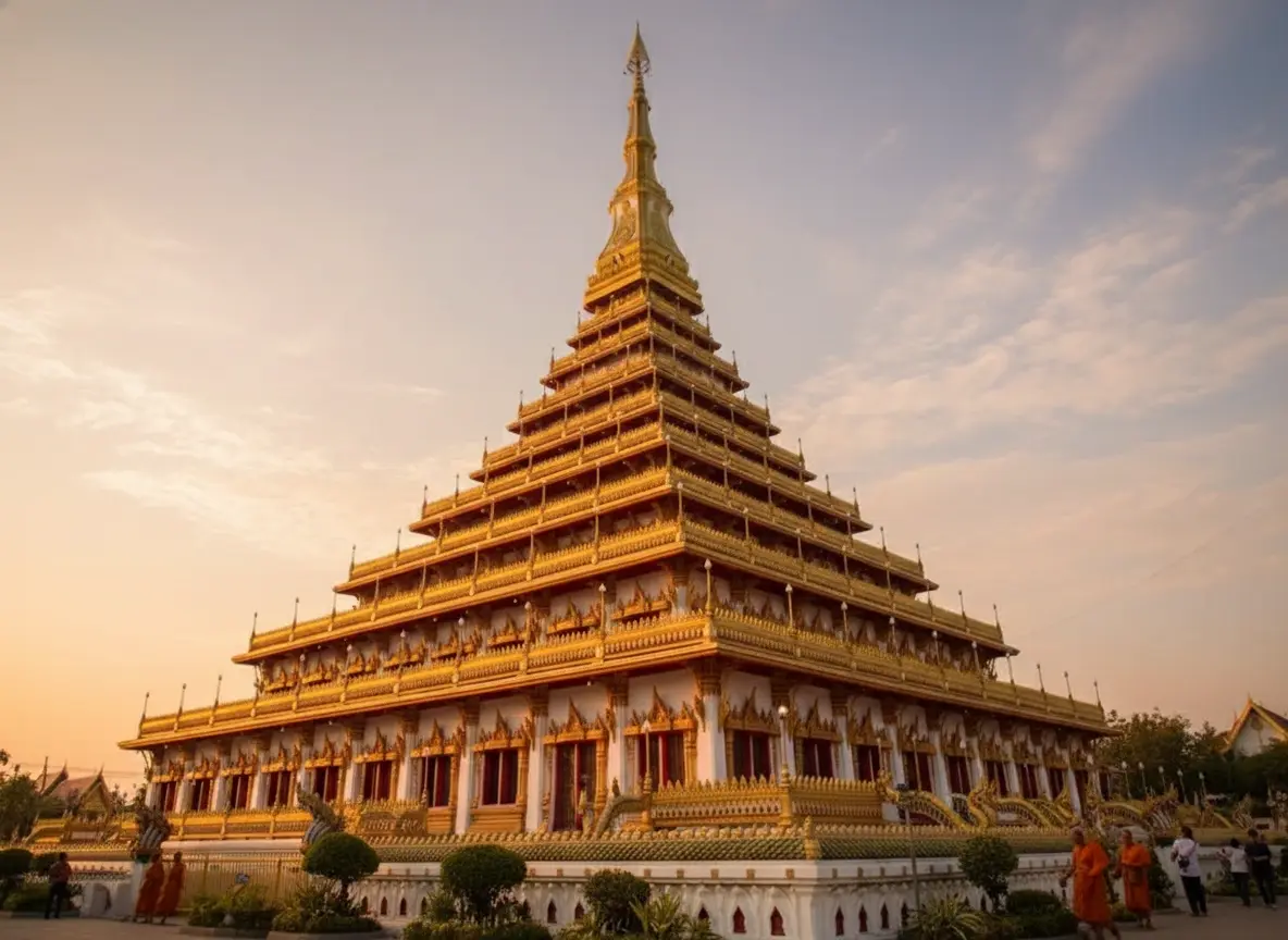 • 7:00 AM – Arrive 🧭 at Phra Mahathat Kaen Nakhon 🛕 for morning prayers 🙏🕯️💨