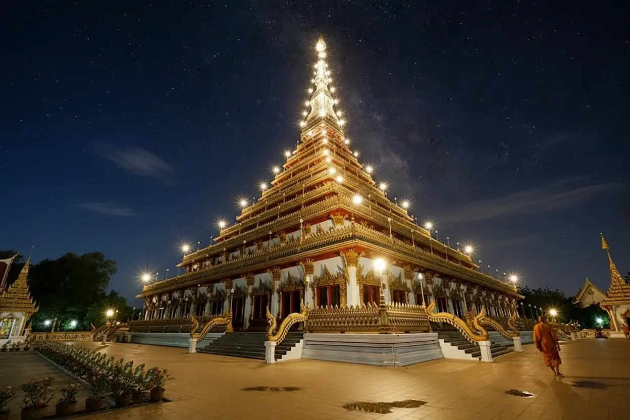 Phra Mahathat Kaen Nakhon, located within the grounds of Wat Nong Wang, is the most revered stupa in Khon Kaen. This magnificent nine-tiered pagoda symbolizes Buddhist teachings and Isaan culture, housing relics of the Buddha and precious scriptures. It is a place of deep spiritual importance and a must-visit landmark for anyone exploring the city’s heritage.