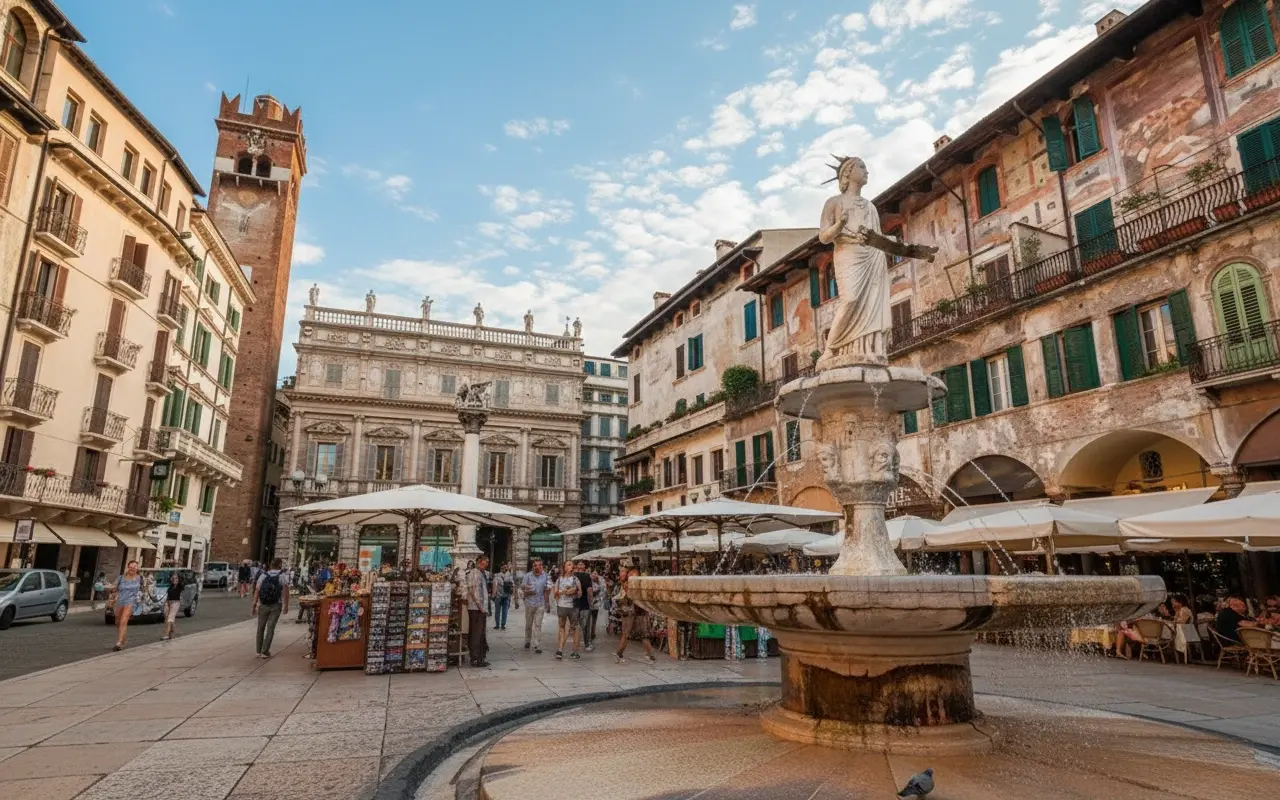 Piazza delle Erbe is one of Verona’s most vibrant and historic squares, located in the heart of the old town. Once the site of the ancient Roman forum, it has evolved into a lively marketplace surrounded by medieval buildings, cafés, and monuments. The square is known for its colorful stalls, elegant palaces, and the lively atmosphere that captures the spirit of Verona.