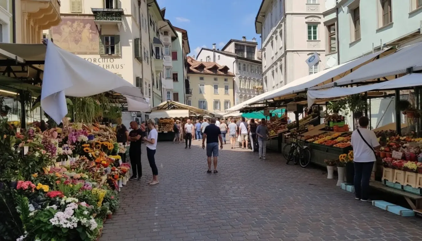 Piazza delle Erbe, or the Market Square, is one of Bolzano’s most colorful and lively spots. Dating back to medieval times, this open-air market has been the center of daily life for centuries. It’s where locals and travelers come together to buy fresh produce, flowers, and Tyrolean specialties while enjoying the authentic rhythm of the city.