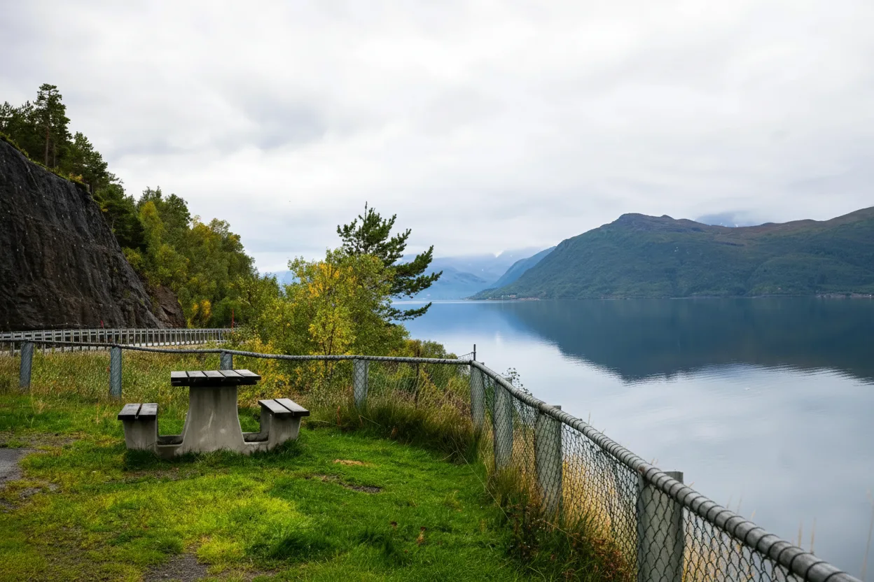 Picnic spots along Hjørundfjorden offer quiet and scenic places to rest, eat, and enjoy the natural surroundings. These spots are often located near calm shorelines, grassy areas, or small viewpoints with open views of the fjord and surrounding mountains. Stopping at a fjord-side picnic area allows travelers to slow down and enjoy the peaceful atmosphere. The calm water, fresh air, and mountain reflections create an ideal setting for relaxed outdoor breaks.