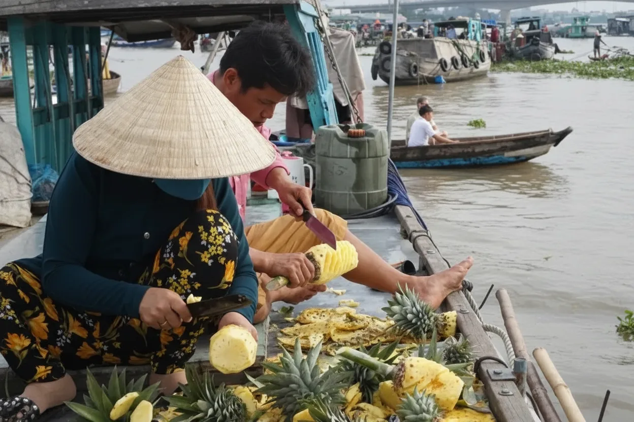 Pineapple boat vendors are a familiar sight at Cái Răng Floating Market, known for selling fresh, ripe pineapples directly from their boats. These vendors display their fruit on long poles, allowing buyers to identify what is being sold from a distance. For travelers, pineapple boats offer a simple and memorable experience. Buying freshly cut fruit while floating on the river reflects the traditional trading style of the Mekong Delta.