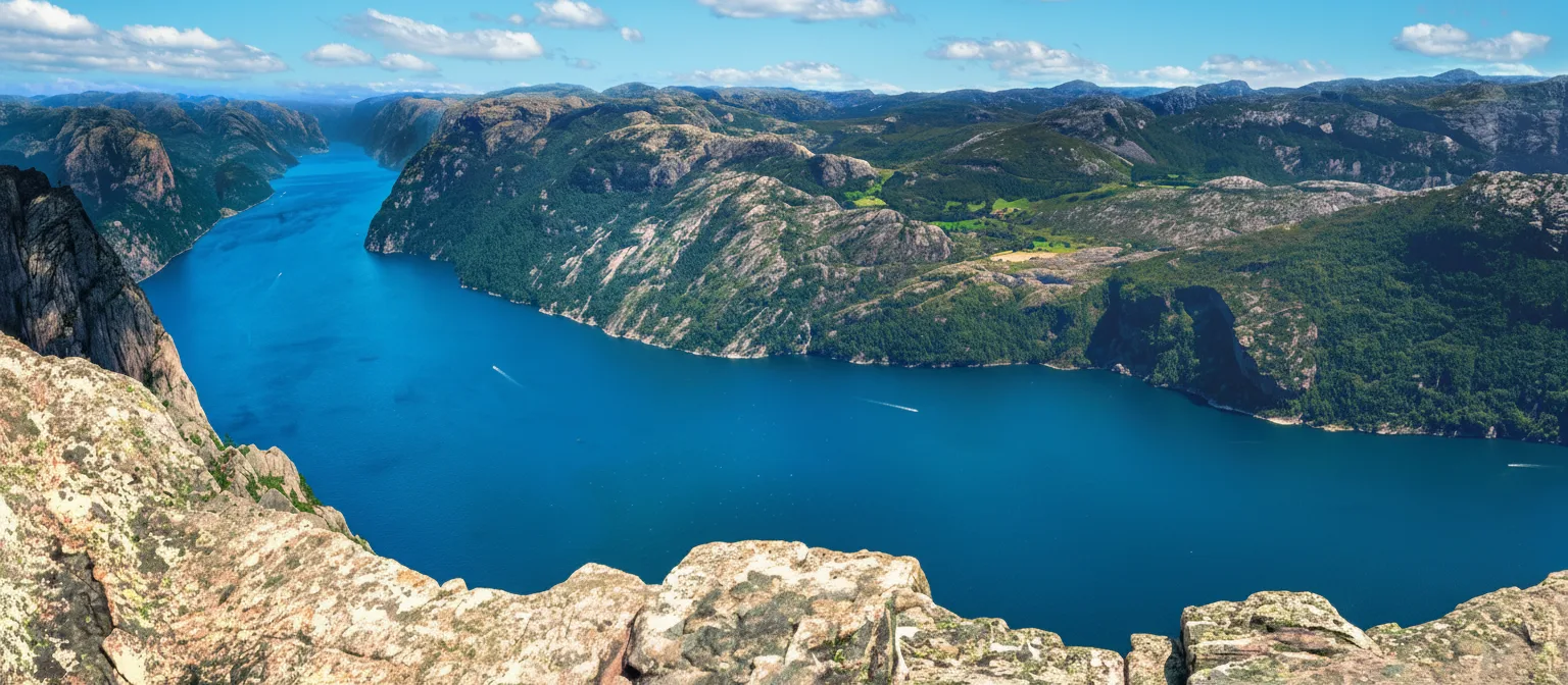Standing on the edge of Preikestolen provides a wide and open view of the fjord far