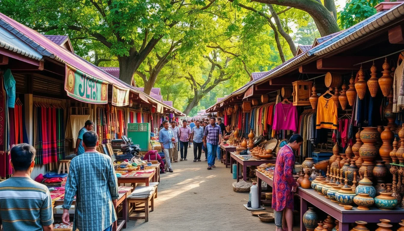 Stalls are filled with handwoven textiles, colorful ponchos, scarves, ceramics, and small