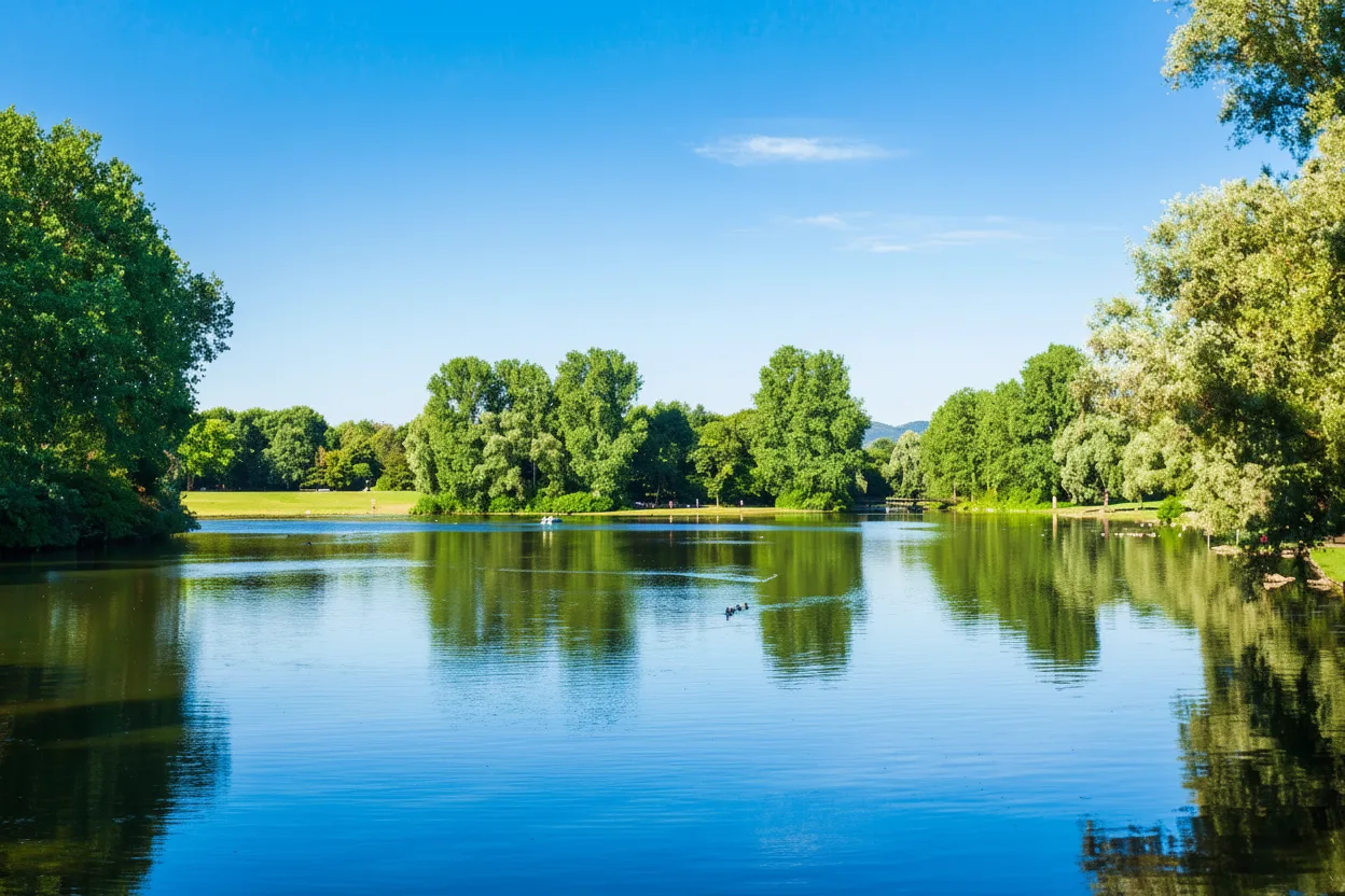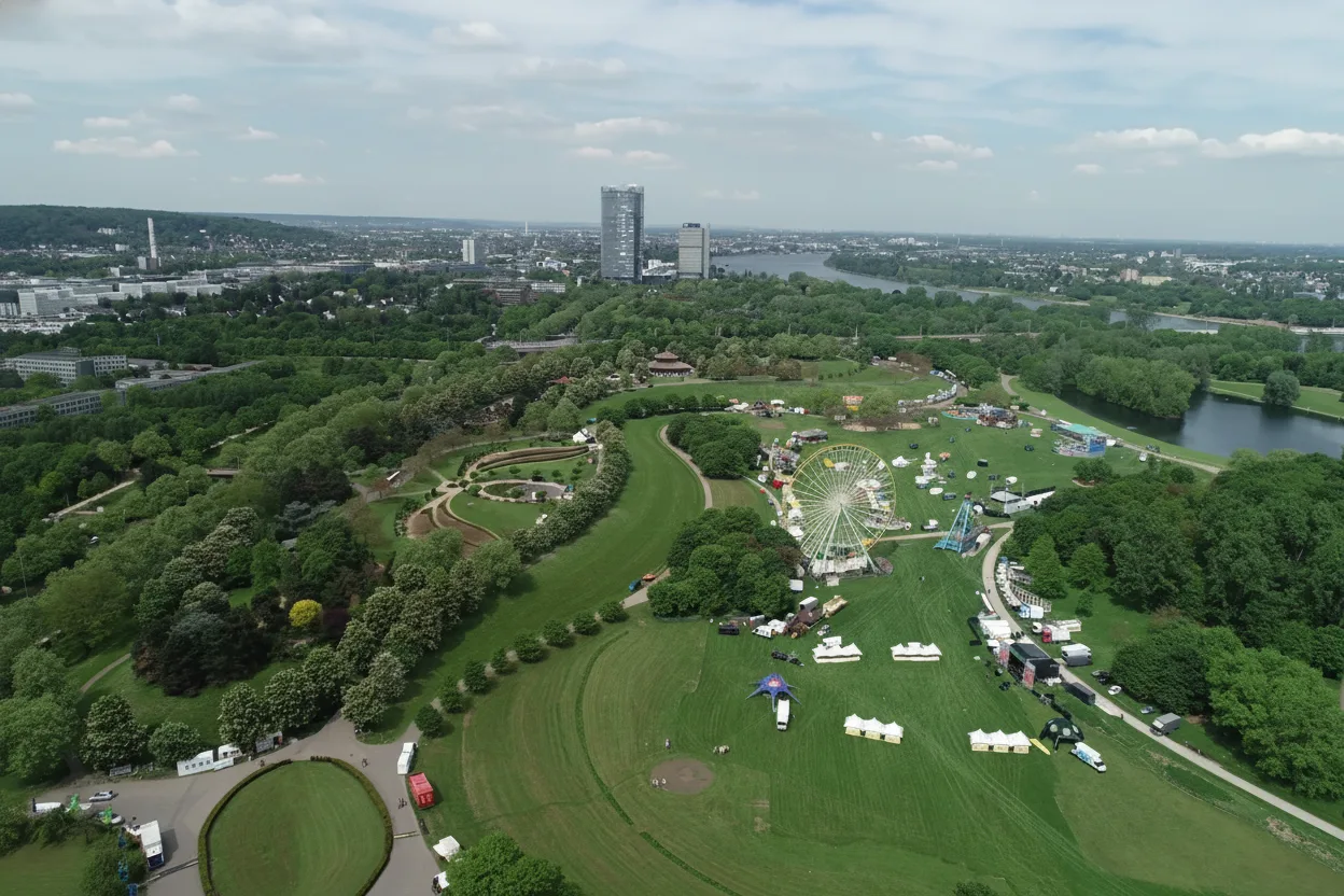 Rheinaue Park is a large urban park located along the Rhine River in Bonn. Known for its wide
