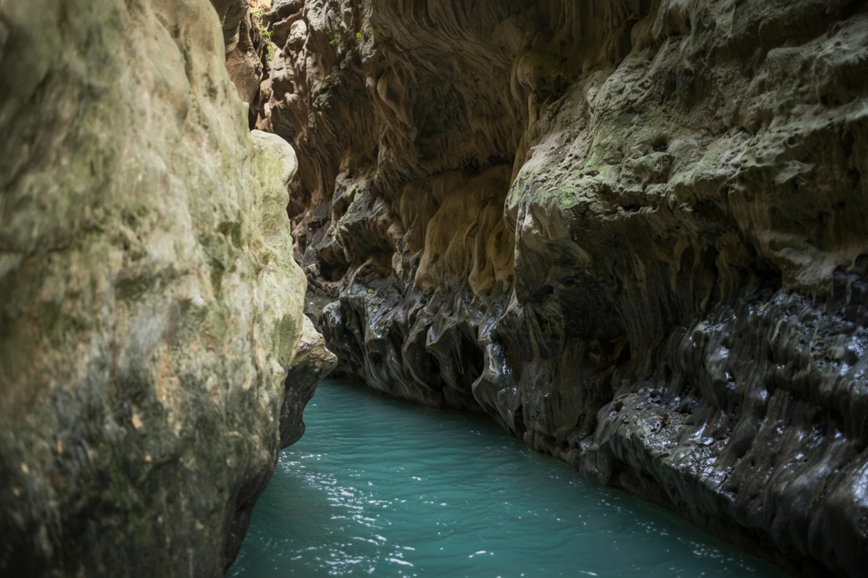 shallow river stream running between towering rock walls.