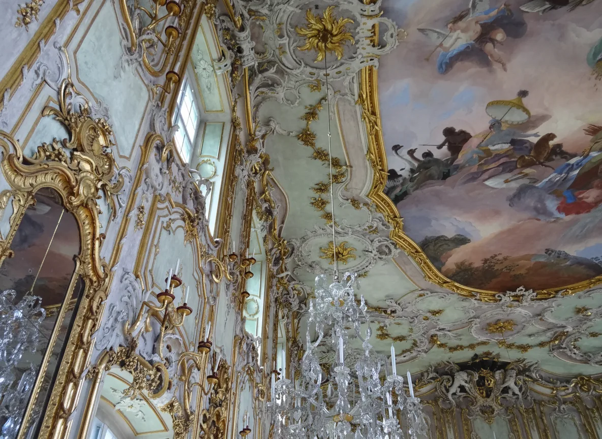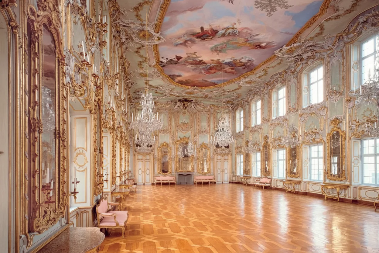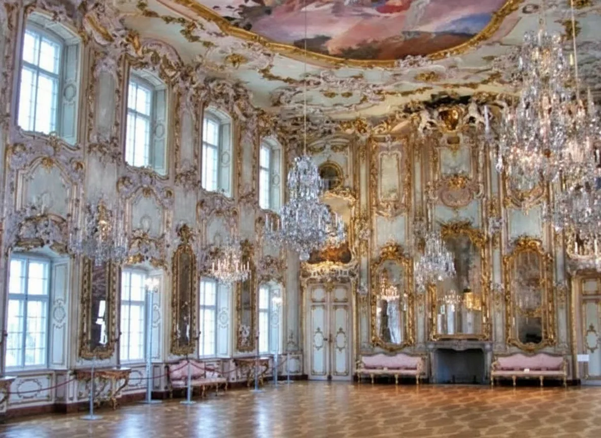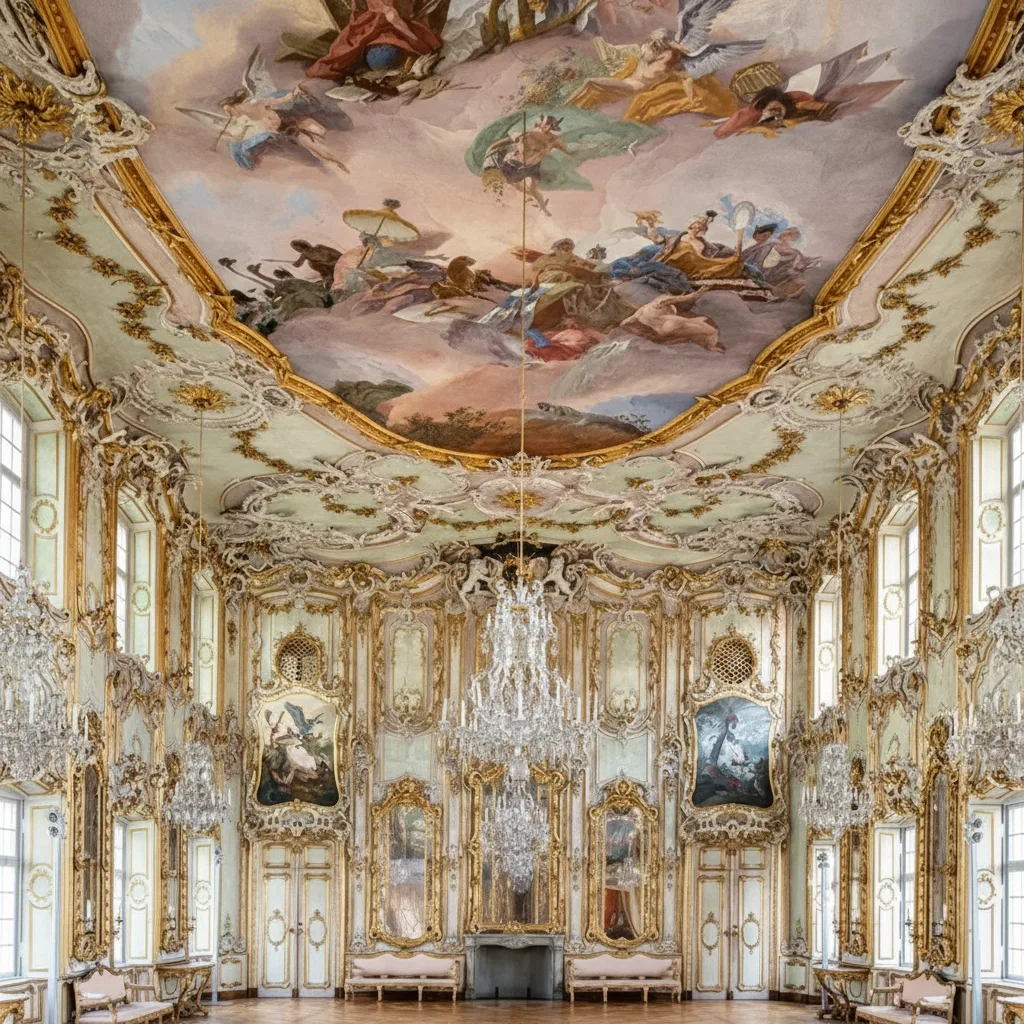 Rococo banquet hall and its connection to European aristocratic history.