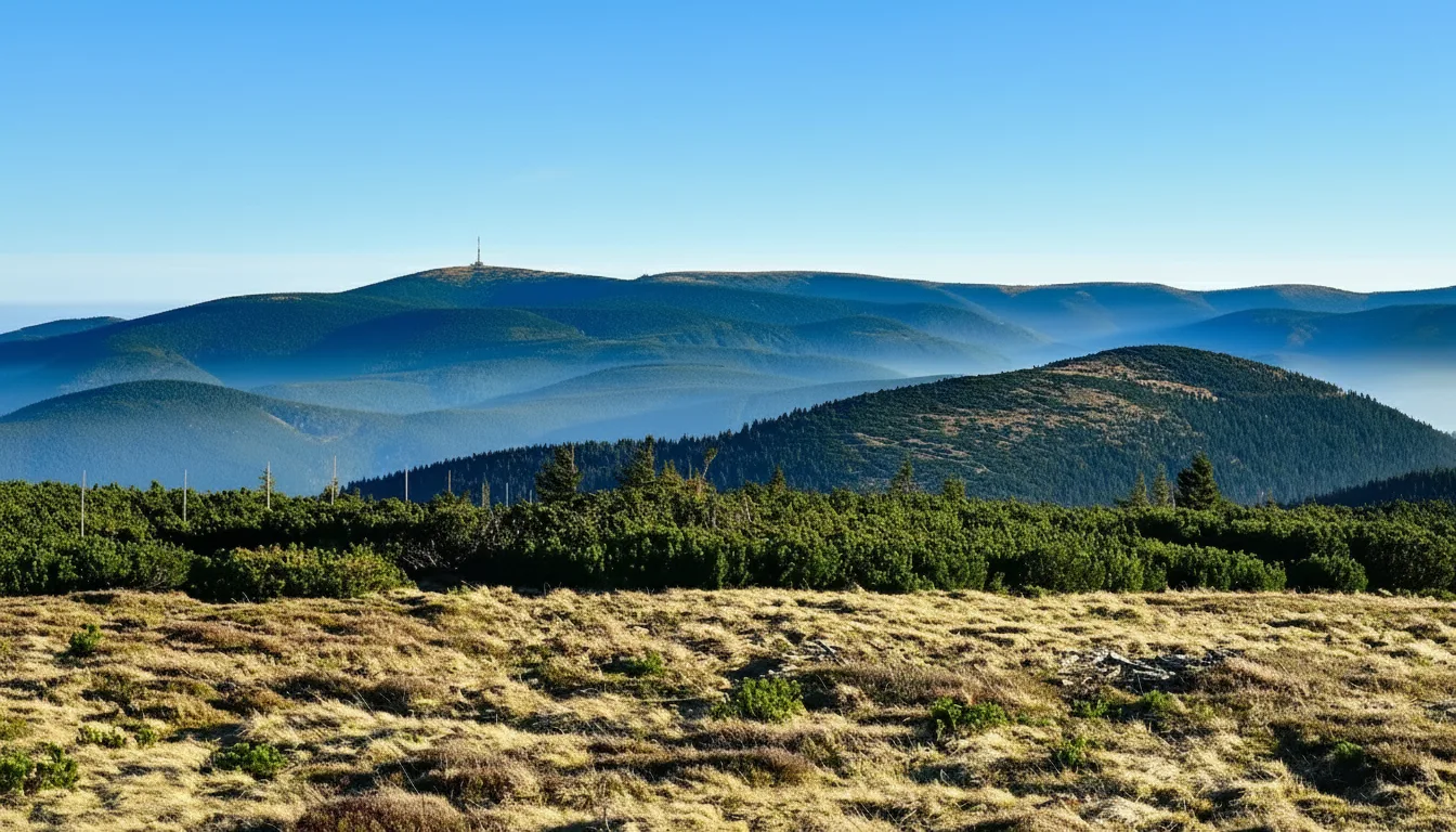 Hiking through the Šerák‒Keprník range allows travelers to experience forest paths, open ridges, and panoramic