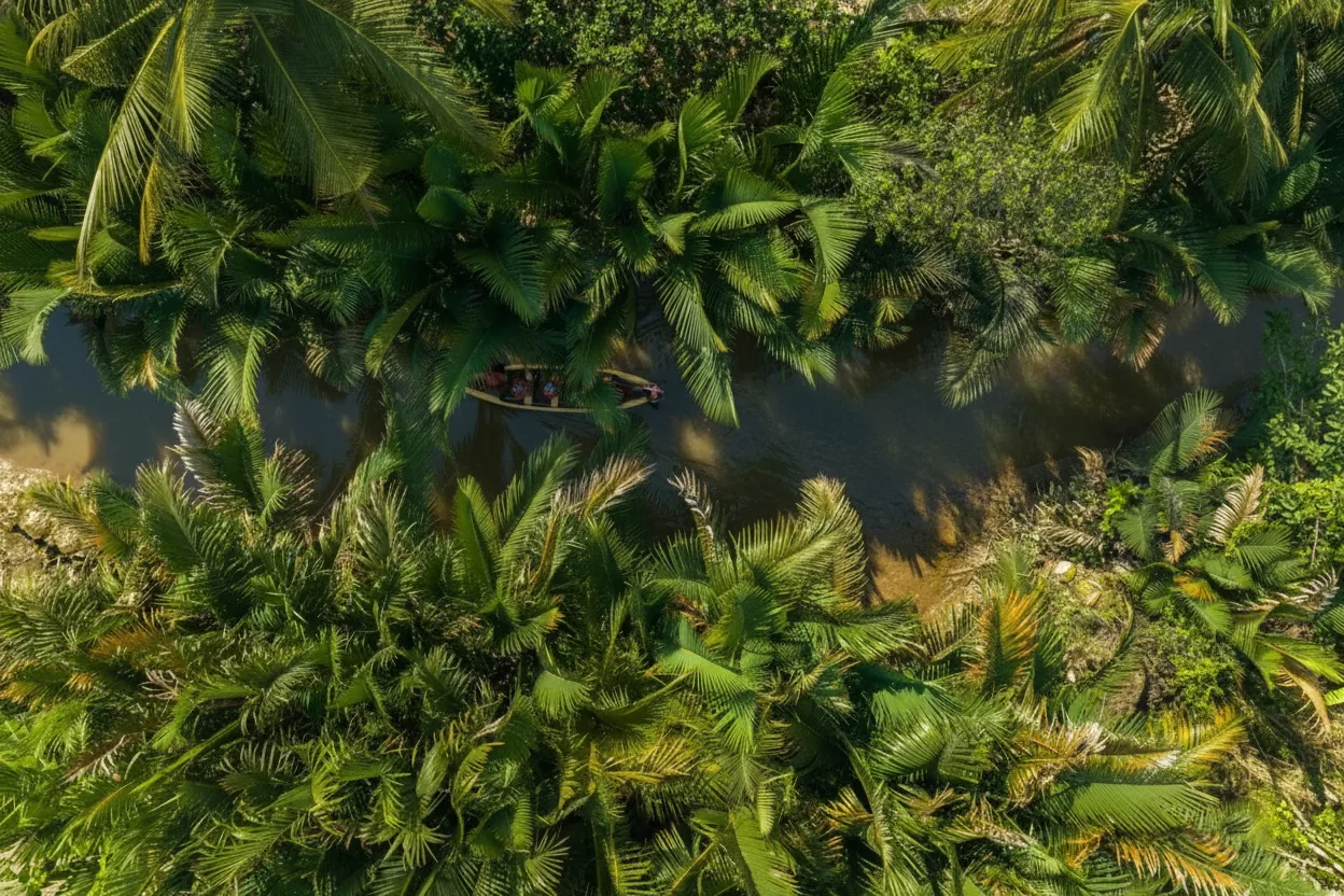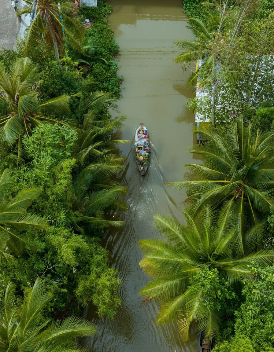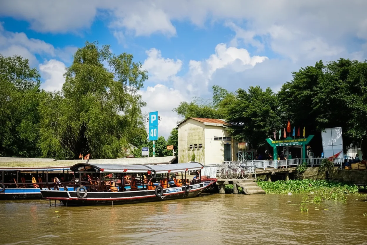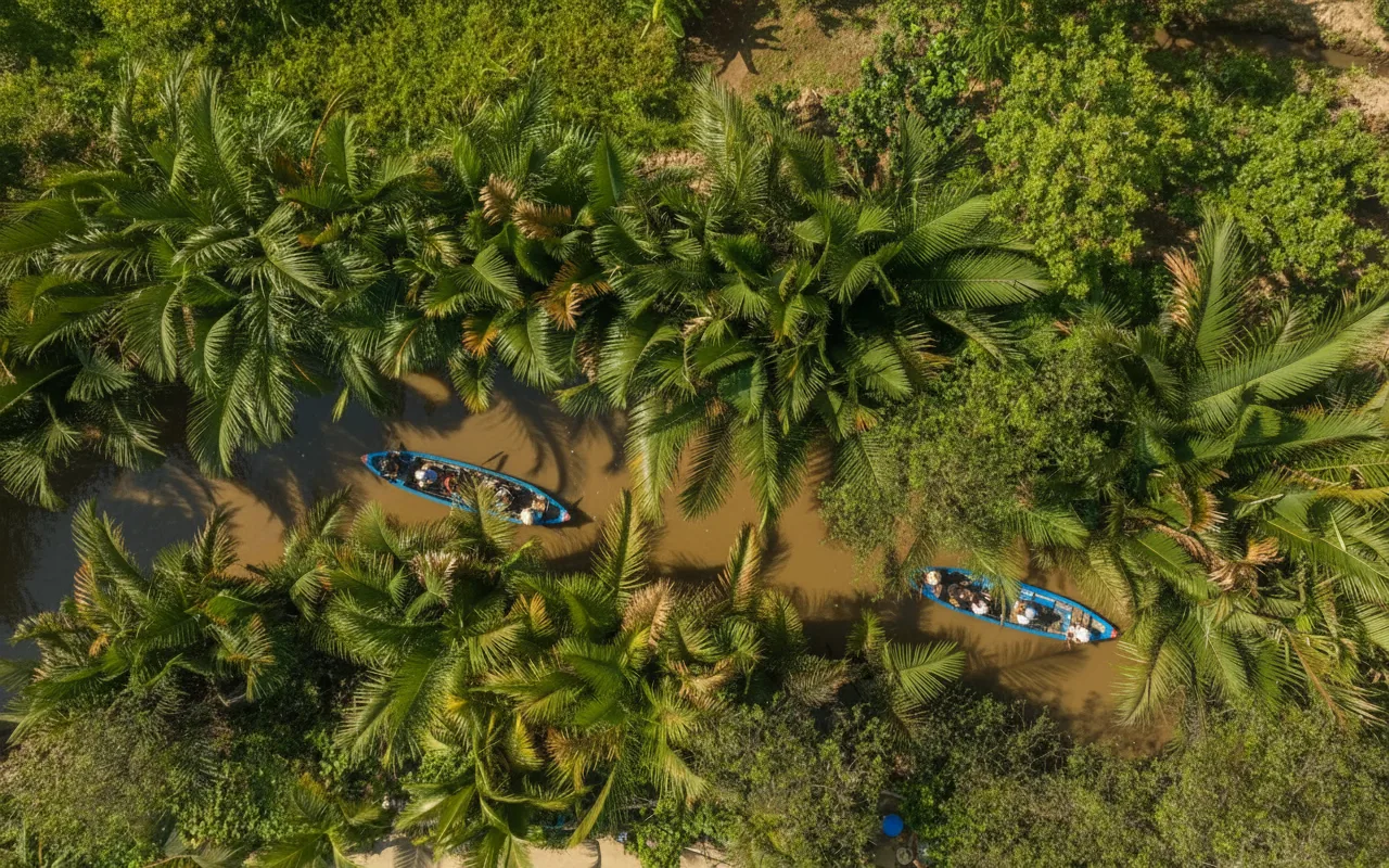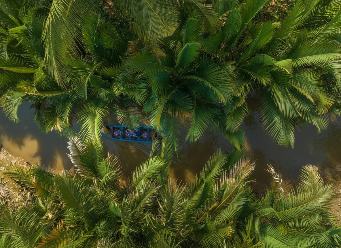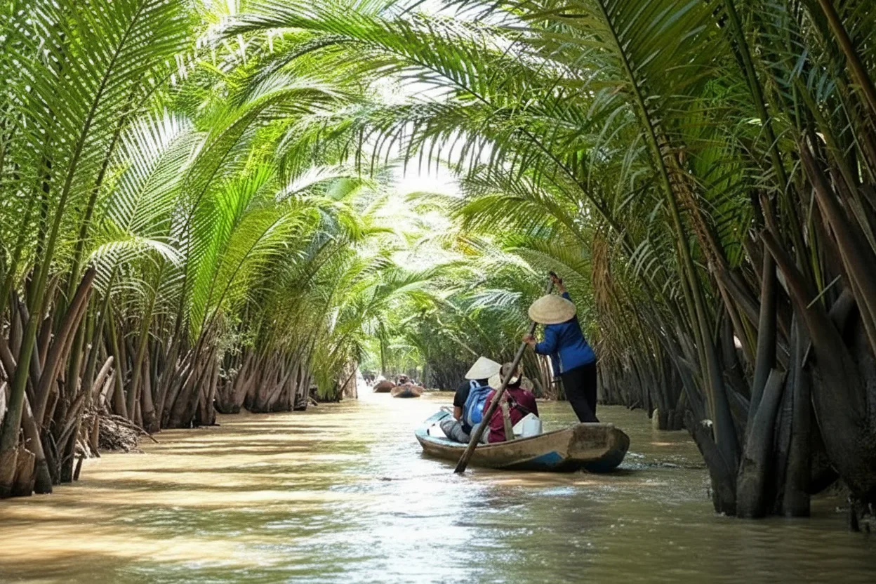 Small canal boat routes are one of the most peaceful ways to experience the Mekong Delta. These narrow waterways pass through fruit gardens, rural villages, and shaded coconut palms, allowing travelers to see daily life along the river at a slow and relaxing pace.