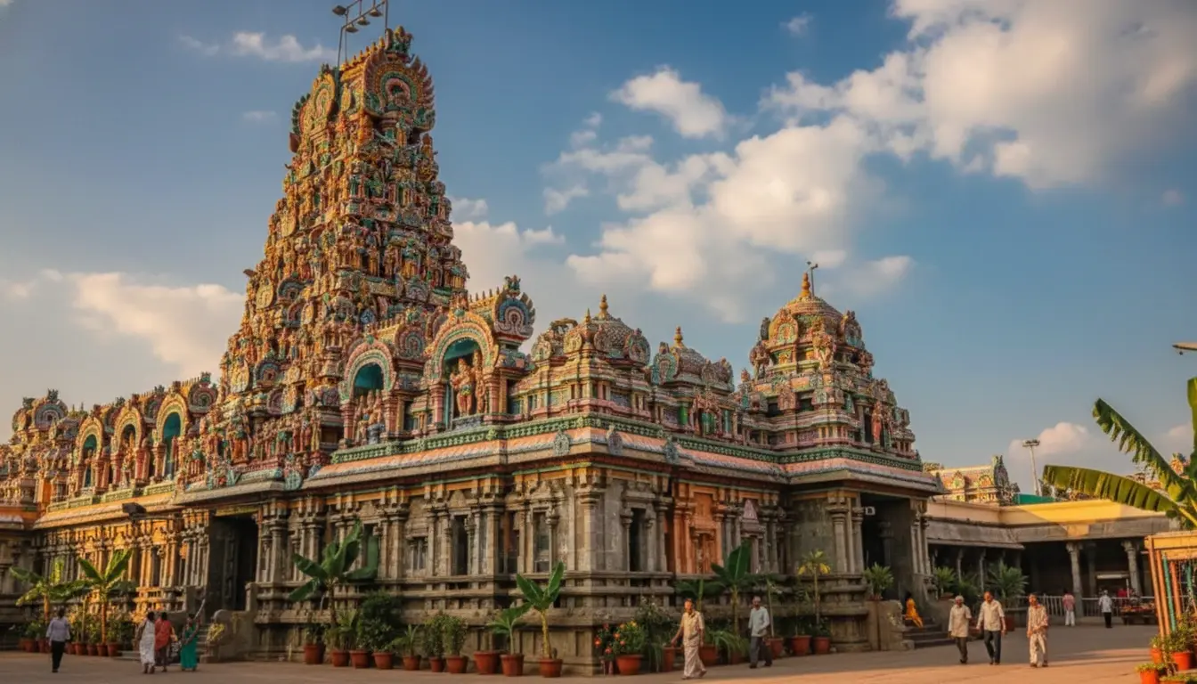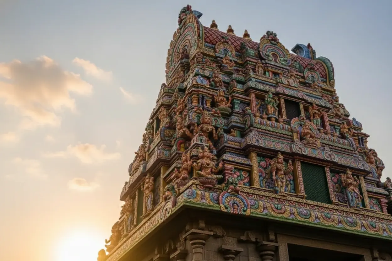• Admire the beautifully sculpted gopuram 🕌 (tower 🗼) featuring deities 🕉️ and mythological figures 👑✨