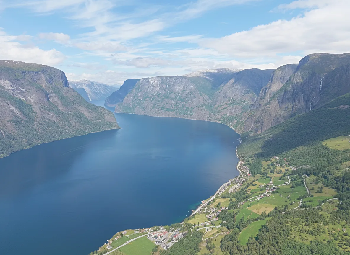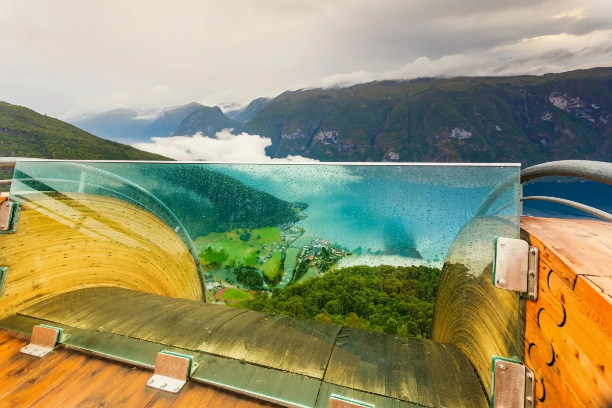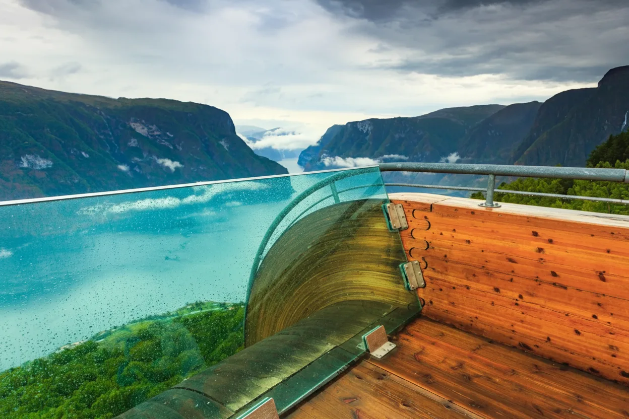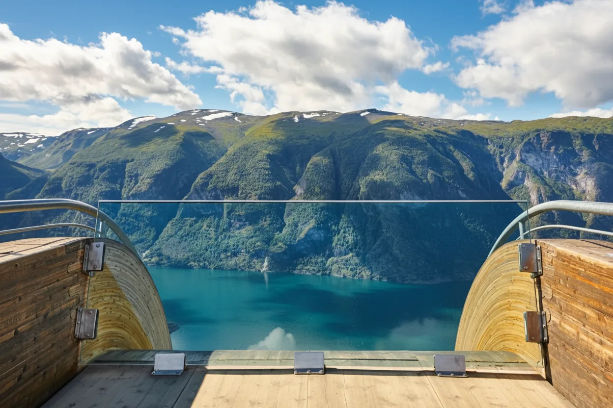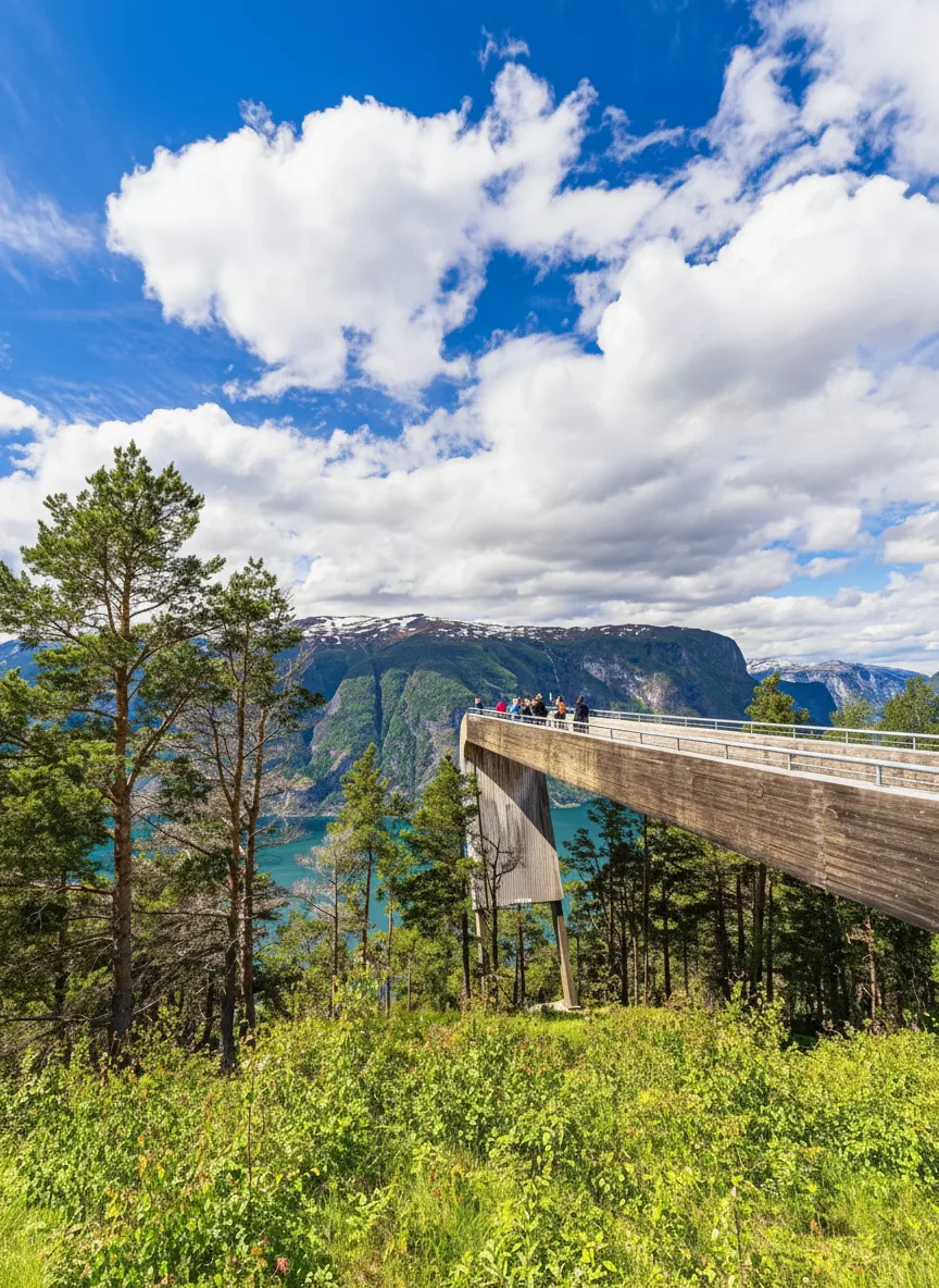 Stegastein Viewpoint is one of the most famous panoramic viewpoints in the Sognefjord region, offering breathtaking views over the Aurlandsfjord from high above the water. The viewpoint extends outward from the mountain, creating a dramatic viewing platform. Standing at Stegastein allows travelers to experience the vast scale of the fjord landscape, with steep mountains, calm waters, and distant villages visible below. It is a popular stop for sightseeing and photography.