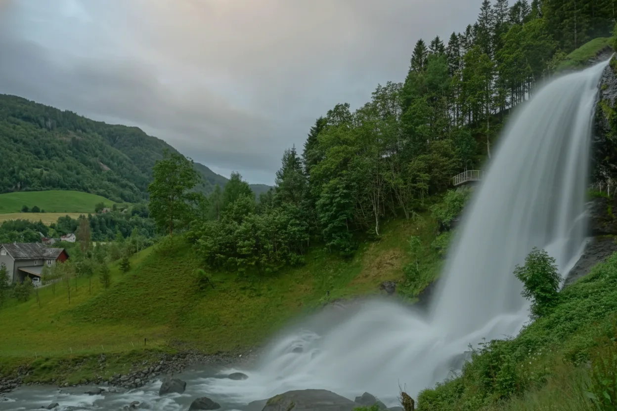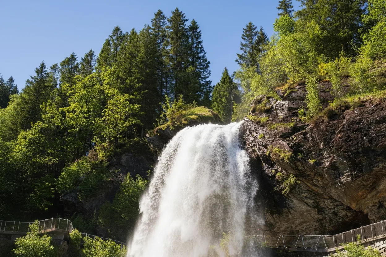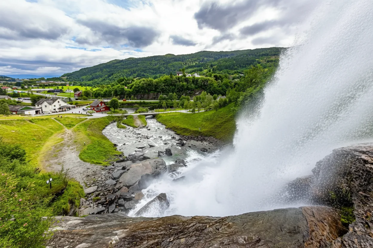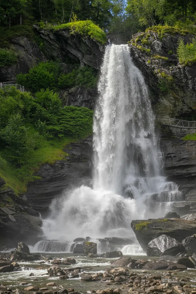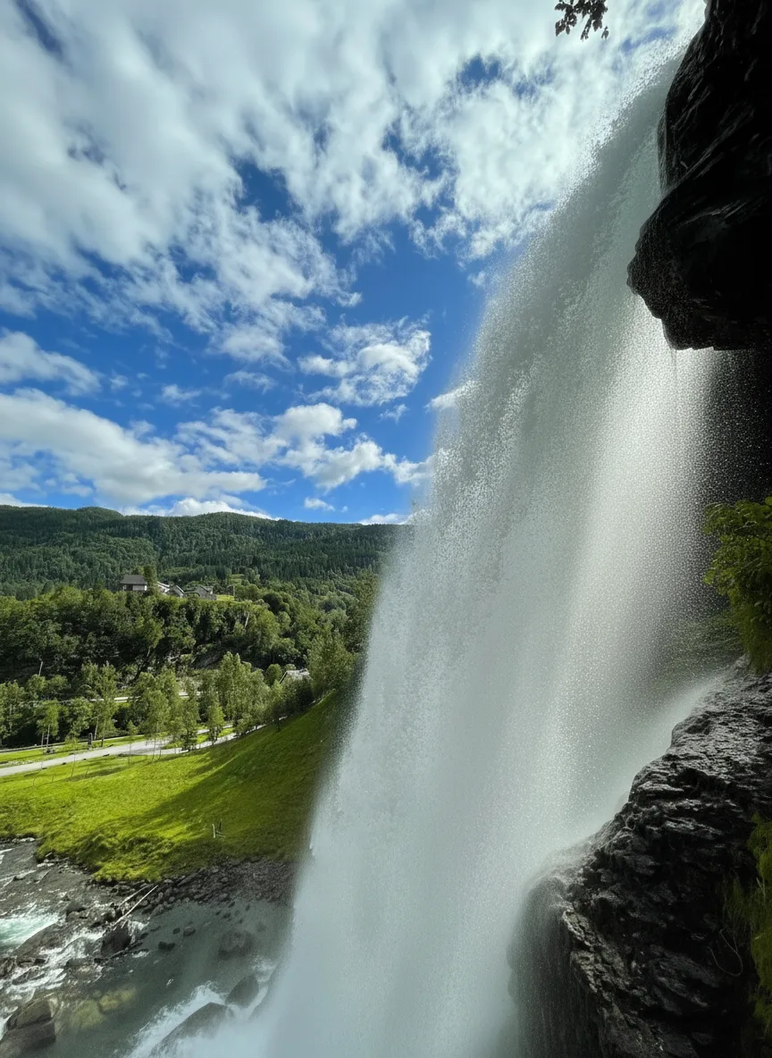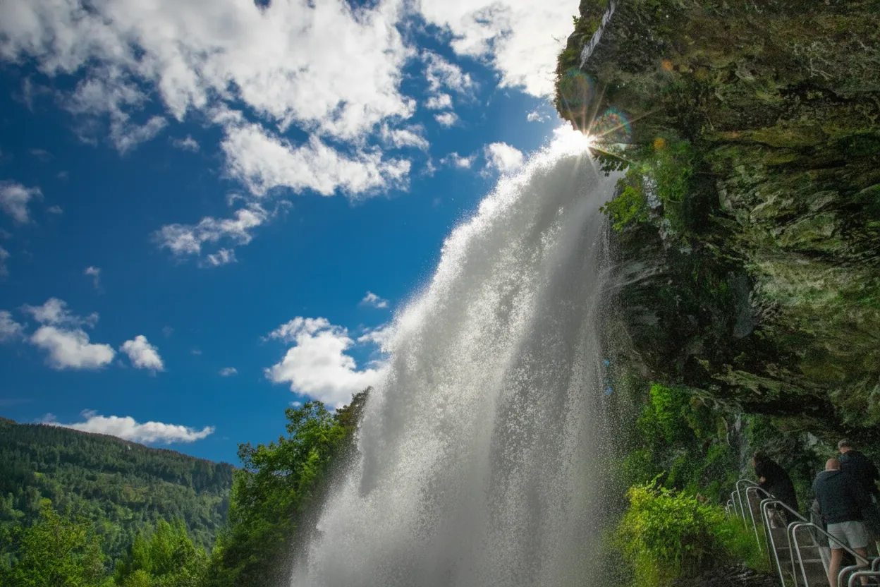Steinsdalsfossen is one of Norway’s most unique waterfalls, famous for the walking path that allows visitors to go behind the falling water. Located near Norheimsund in the Hardangerfjord region, it is easily accessible and suitable for travelers of all ages. The waterfall is especially impressive during spring and early summer when snowmelt increases the water flow. The paved path and tunnel make it possible to enjoy the waterfall safely while staying dry under normal conditions.