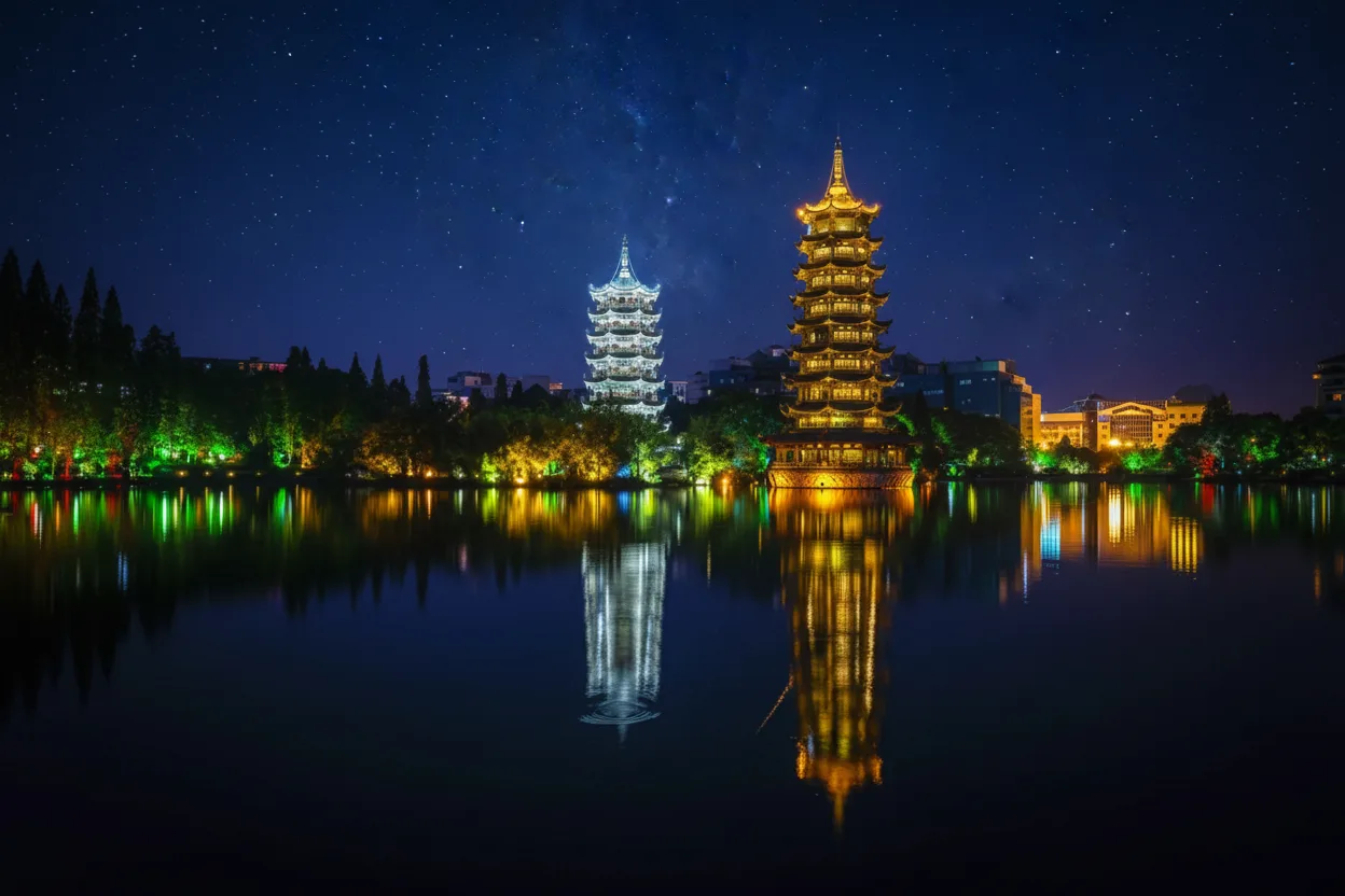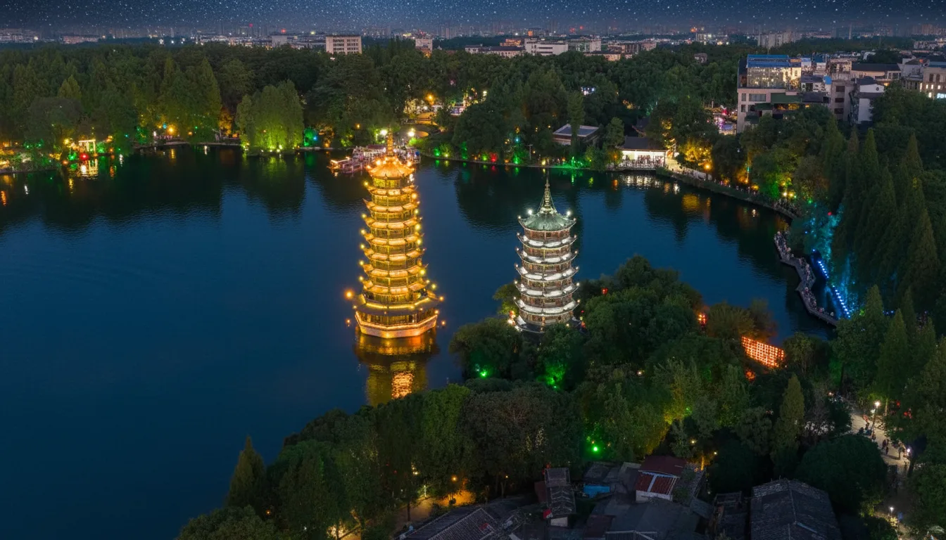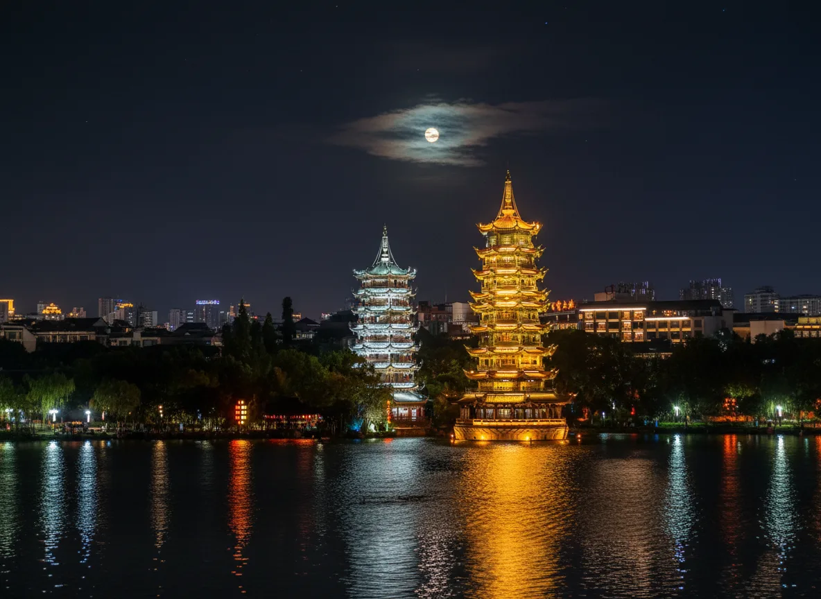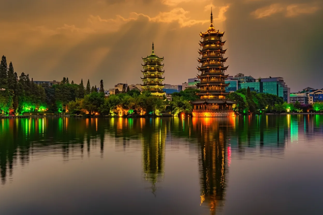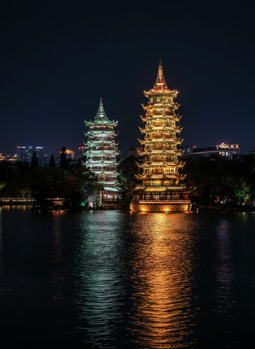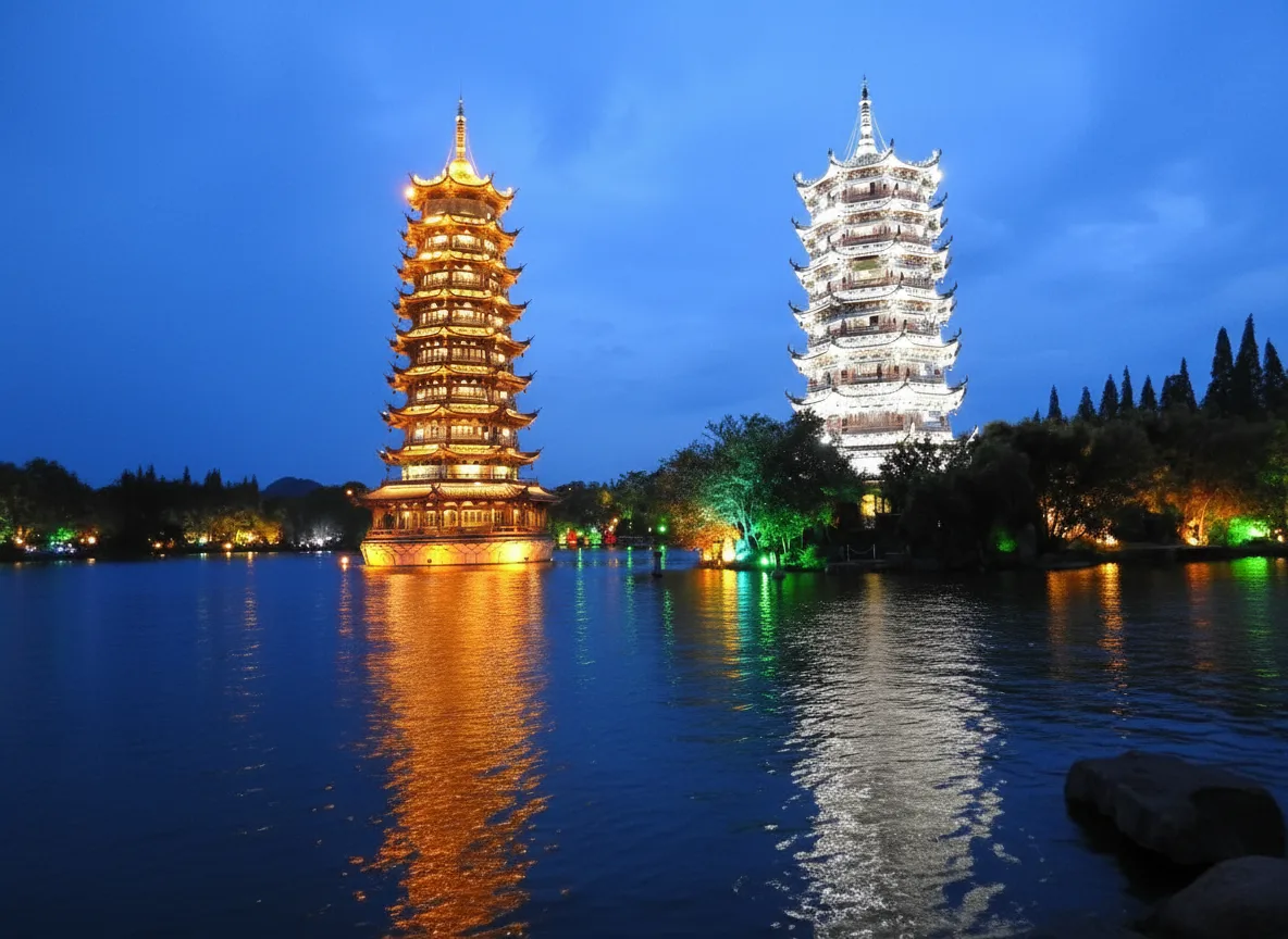 in Guilin, China. Located in the center of Shan Lake, these two elegant towers