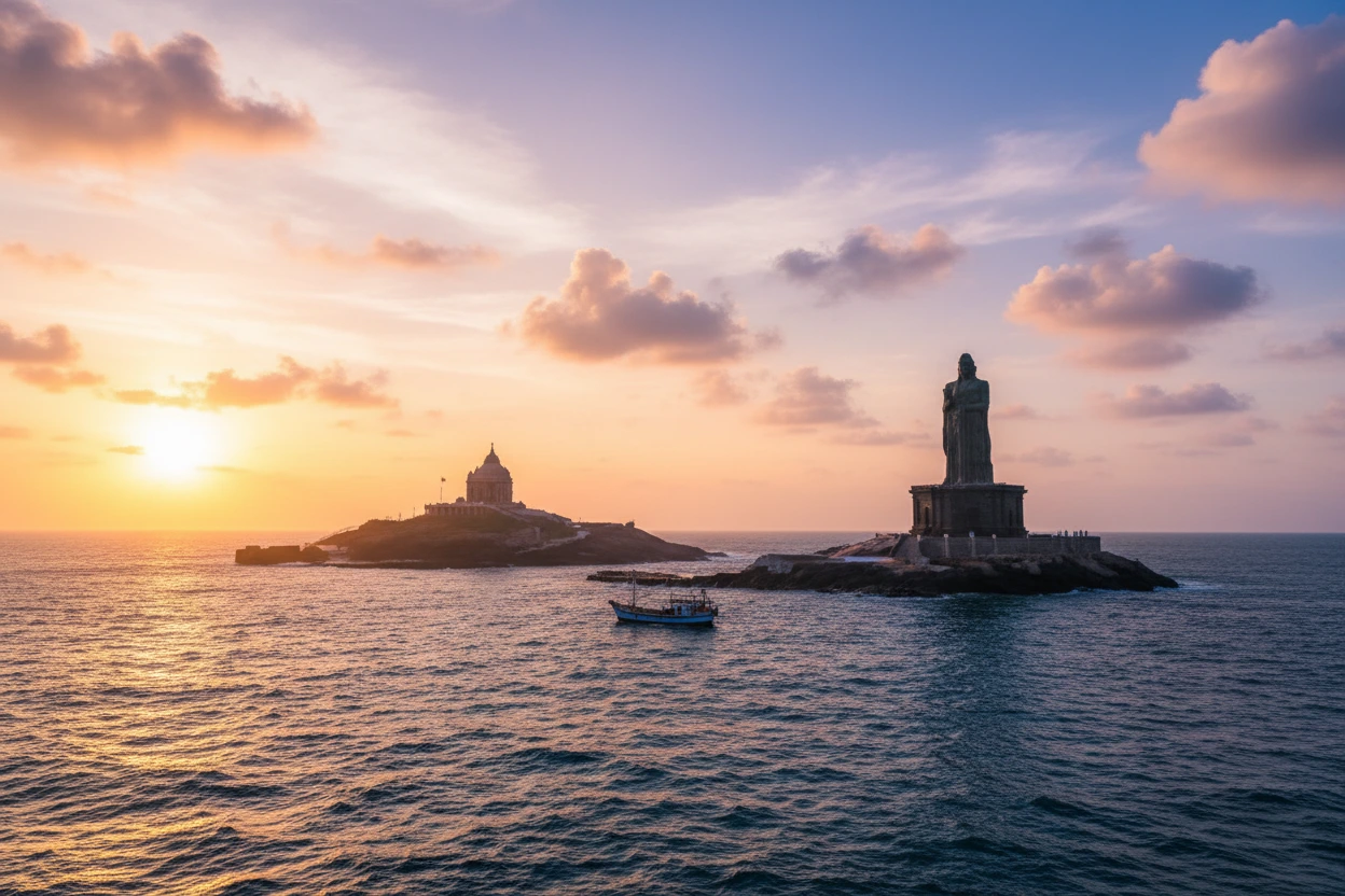 Sunrise Point in Kanyakumari is one of the most popular locations in India for watching the sunrise. Positioned at the southern tip of the country, the viewpoint offers an unobstructed horizon where the Bay of Bengal, Arabian Sea, and Indian Ocean meet. Visitors gather early to witness the sky change colors, creating a dramatic and memorable coastal experience. The viewpoint is easily accessible and ideal for photography, relaxation, and observing morning coastal activities.