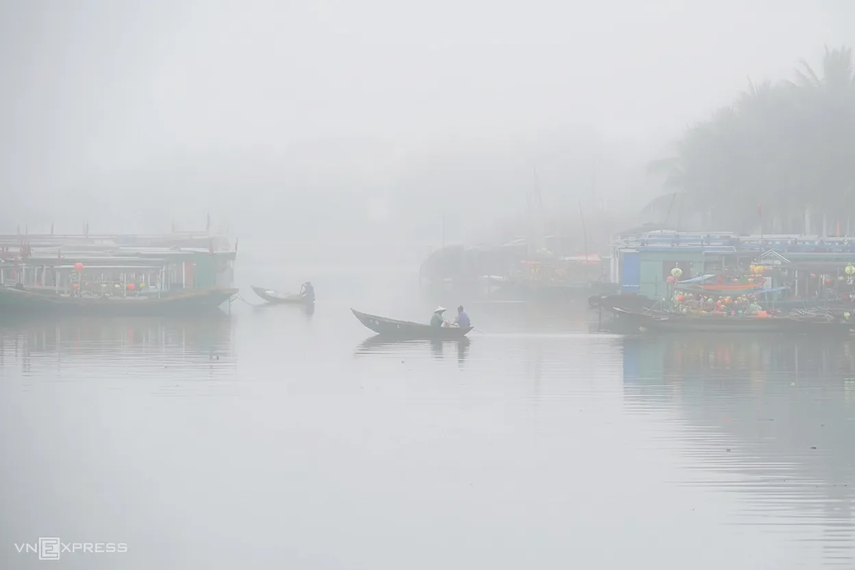 starting their day, and boats moving slowly through the mist. The atmosphere is quiet