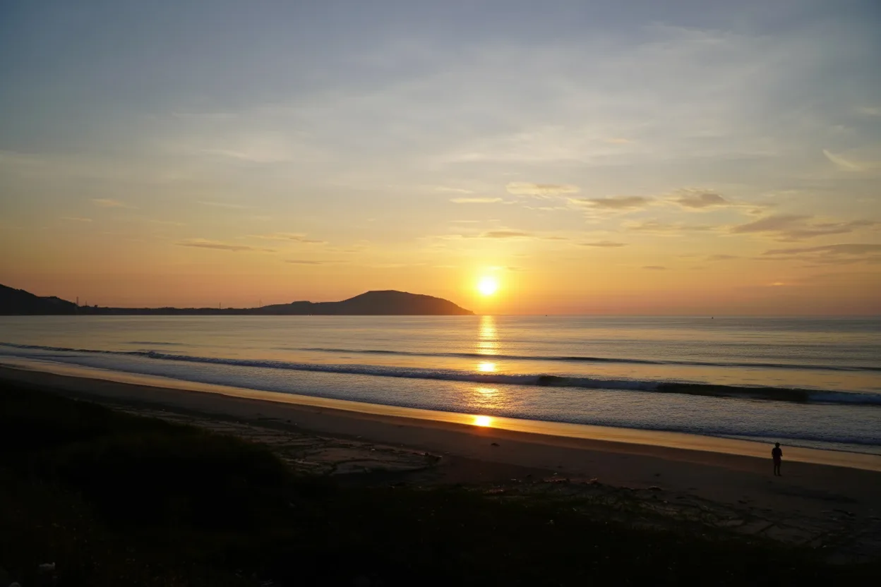 the horizon, warm golden light spreads across the sea, soft waves, and quiet