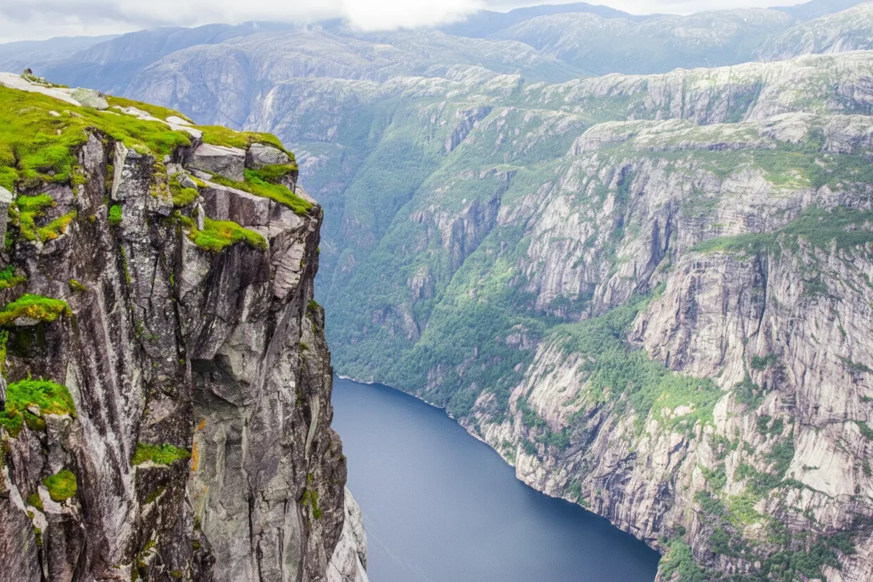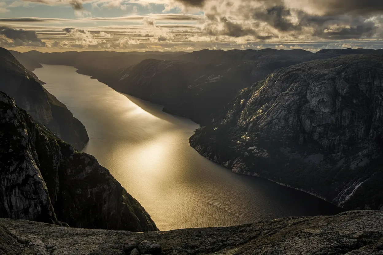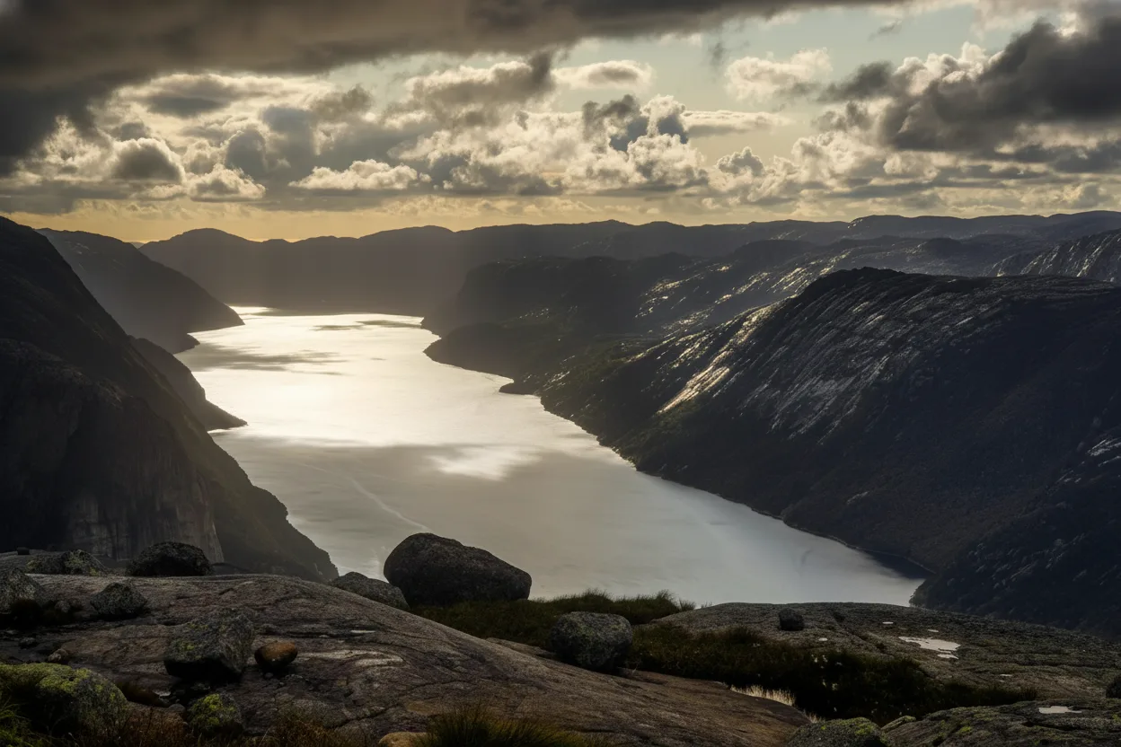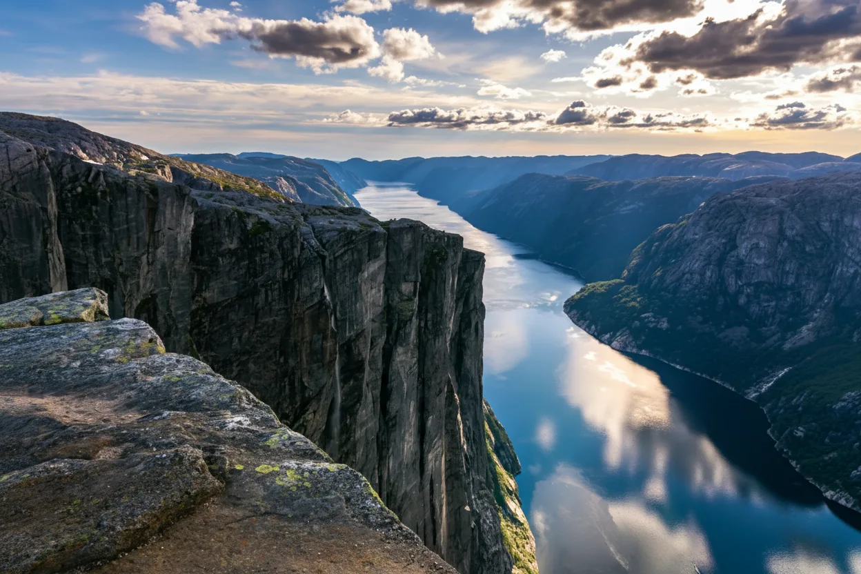 Sunset cliff views around Kjerag offer dramatic evening scenes as warm light spreads across the cliffs and Lysefjord below. As the sun lowers, rock faces glow with changing colors, creating a calm and atmospheric mountain experience. These locations are ideal for quiet observation after a long hike. Evening light softens the landscape, making it a favorite time for photography and reflection. For travelers who stay late on the mountain, sunset cliff views provide a memorable end to the Kjerag hiking day.