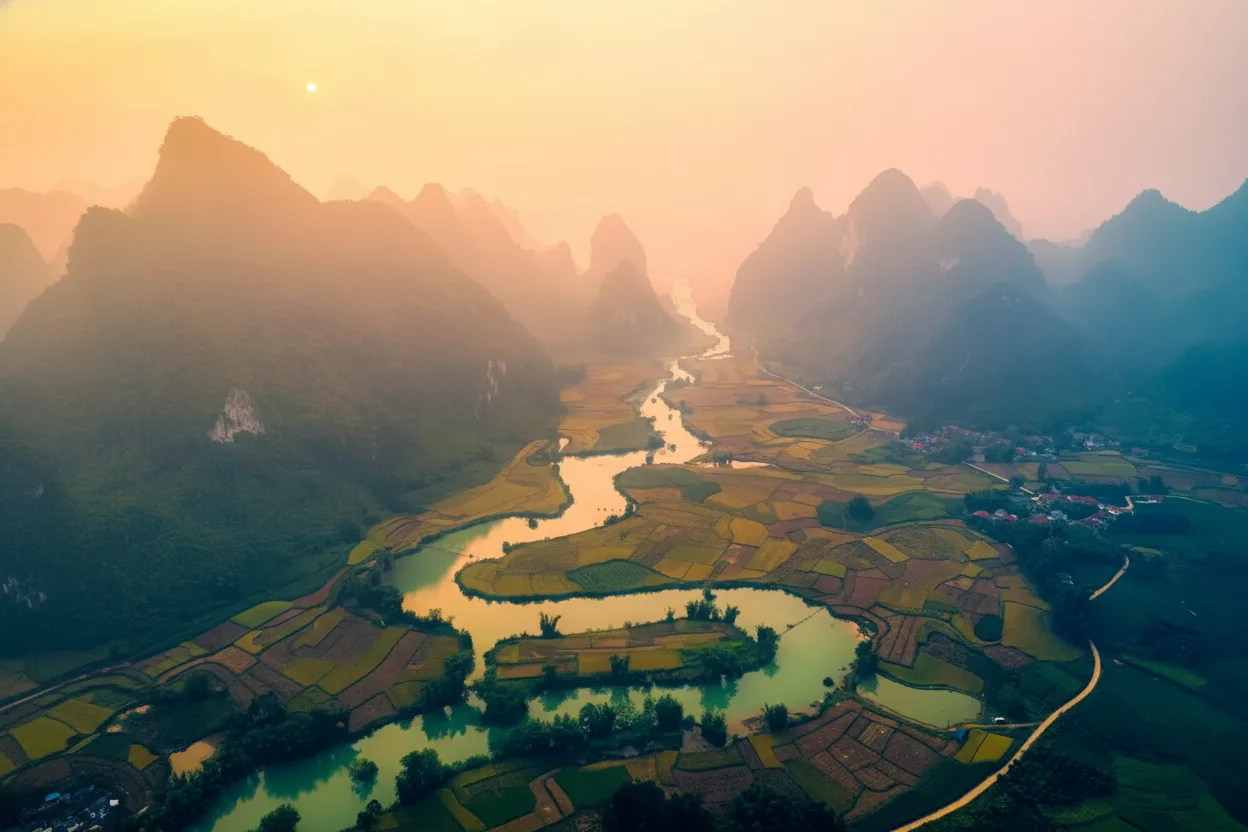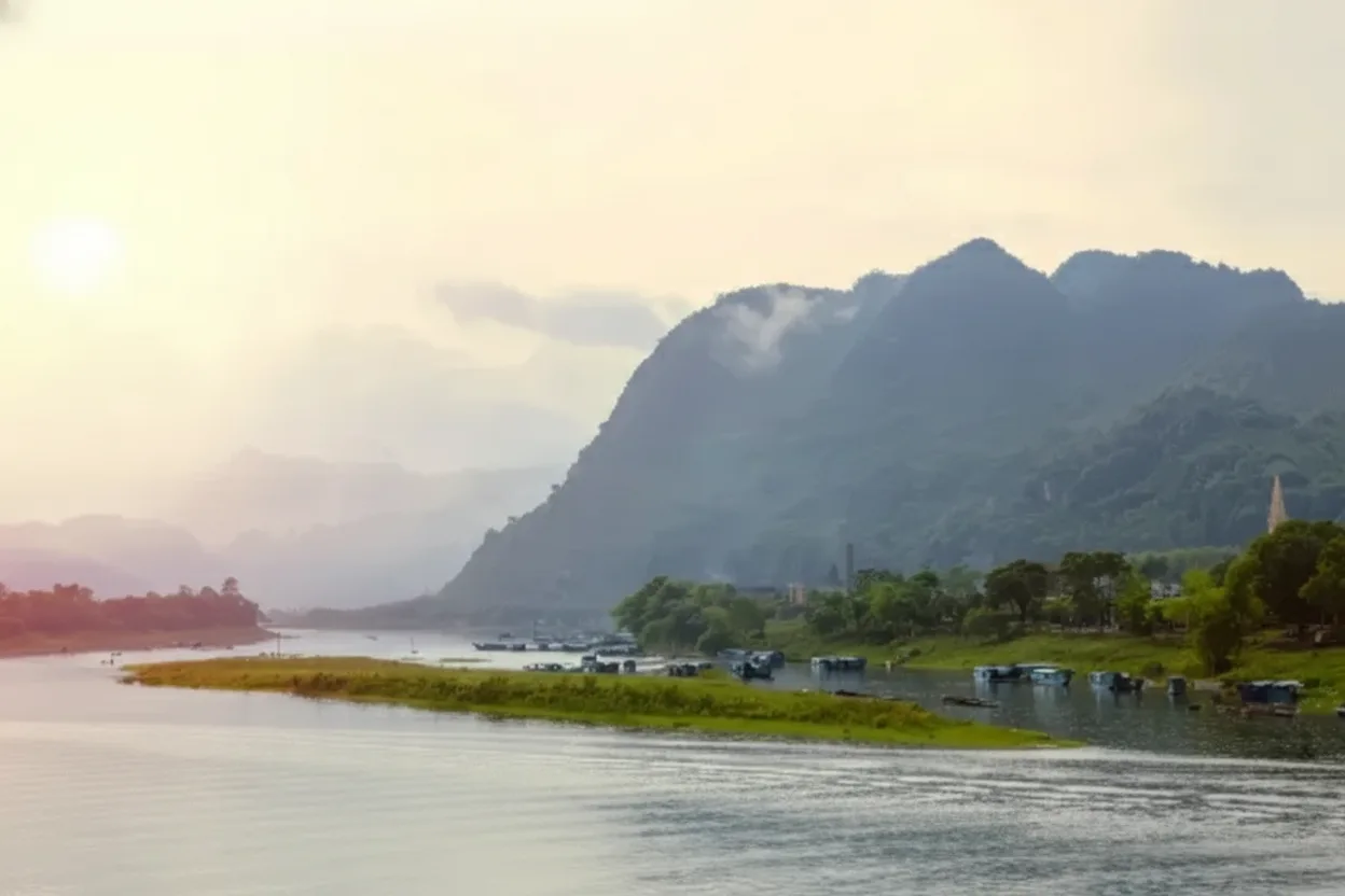 over limestone mountains, small boats, and village houses. The peaceful