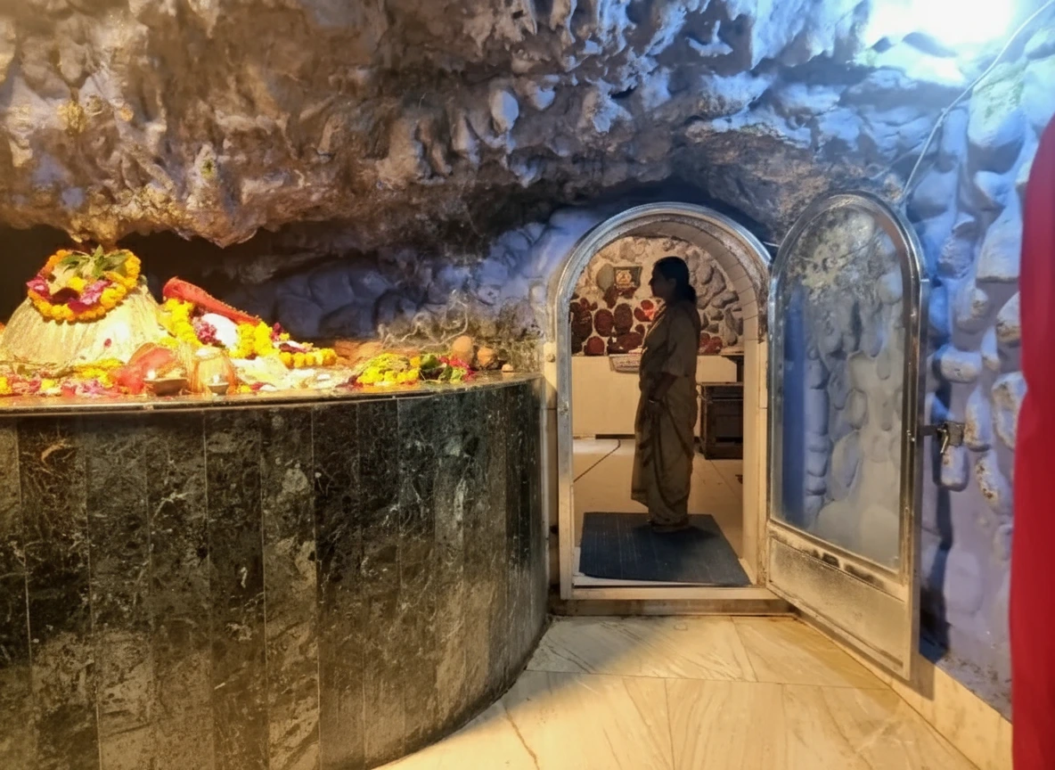 Shiva. The temple features a naturally dripping water stream that falls directly
