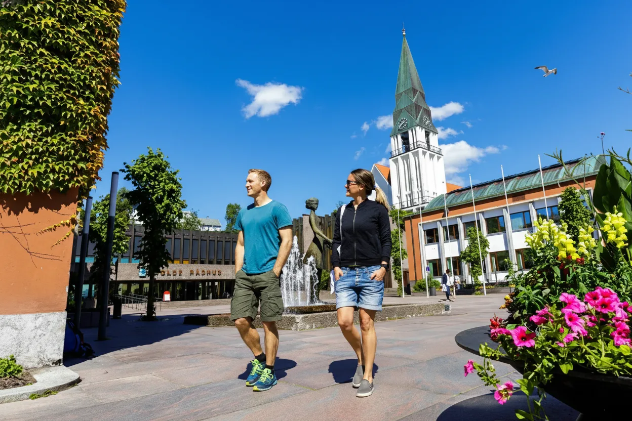 • 🚶 Stroll through the pedestrian-friendly Storgata 🌹 and see the Rose Maiden statue 🏛️