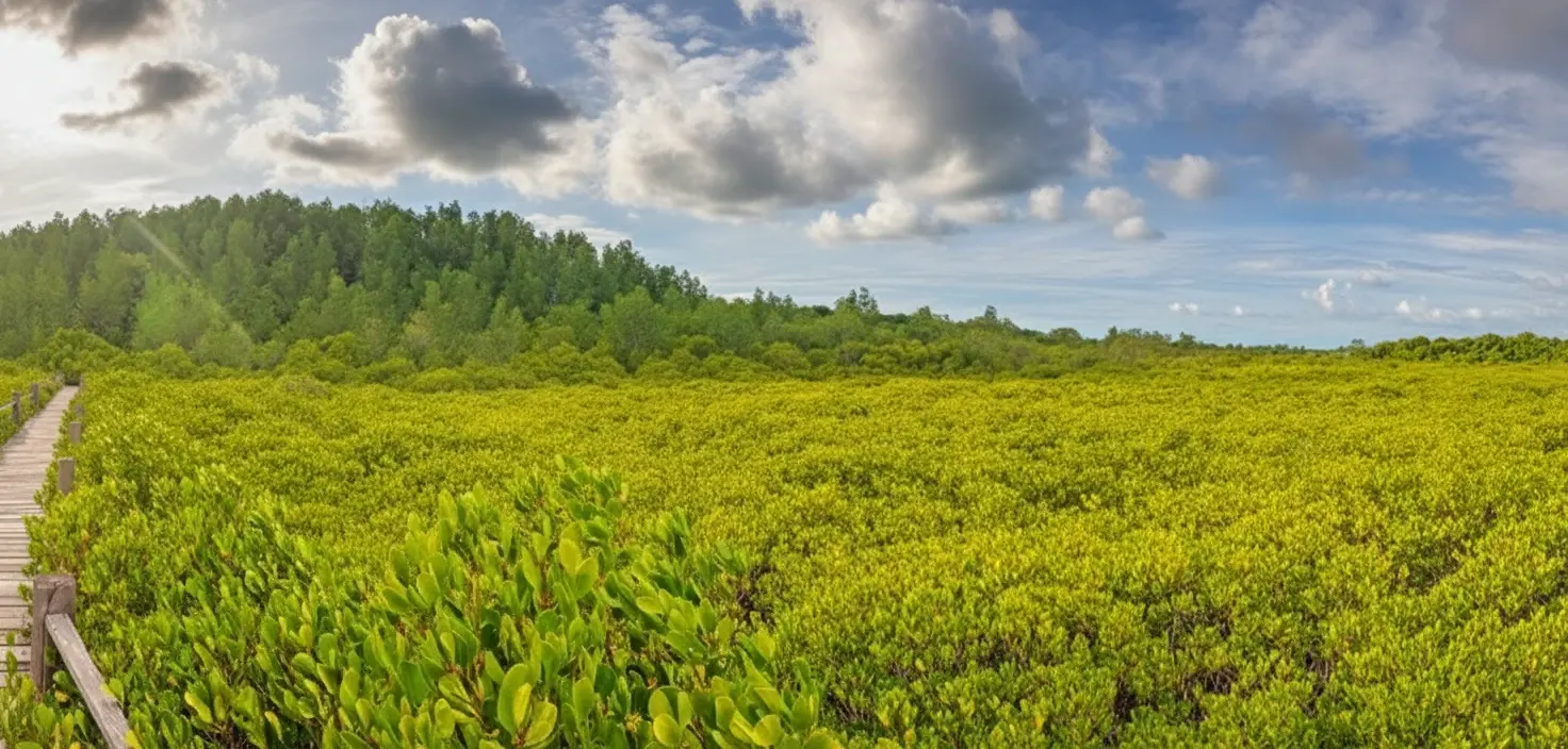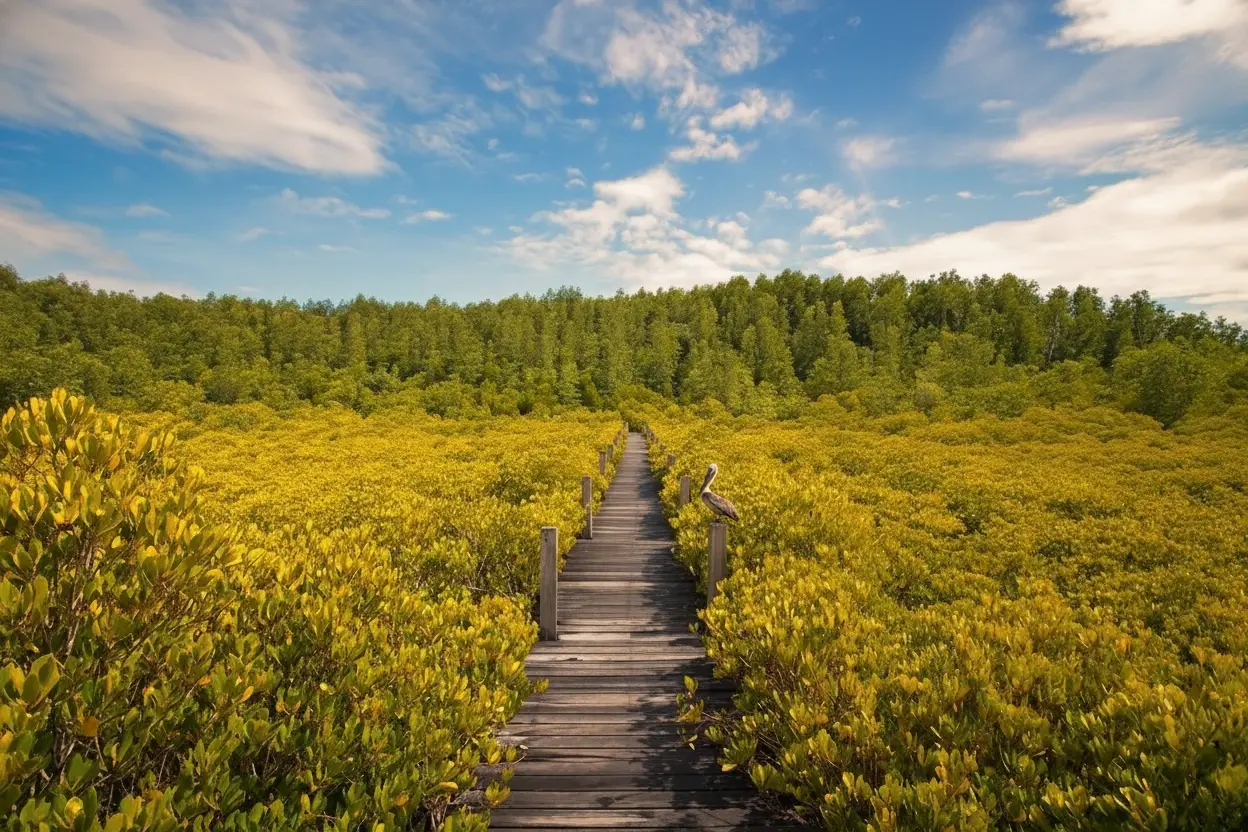 • Walk 🚶‍♀️ along the 2 km-long 🗺️ wooden boardwalk 🌳 through the golden mangroves ✨💚
