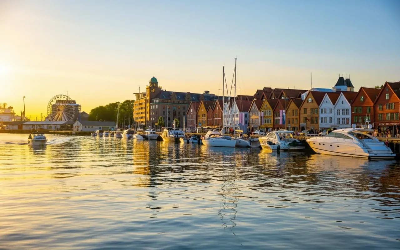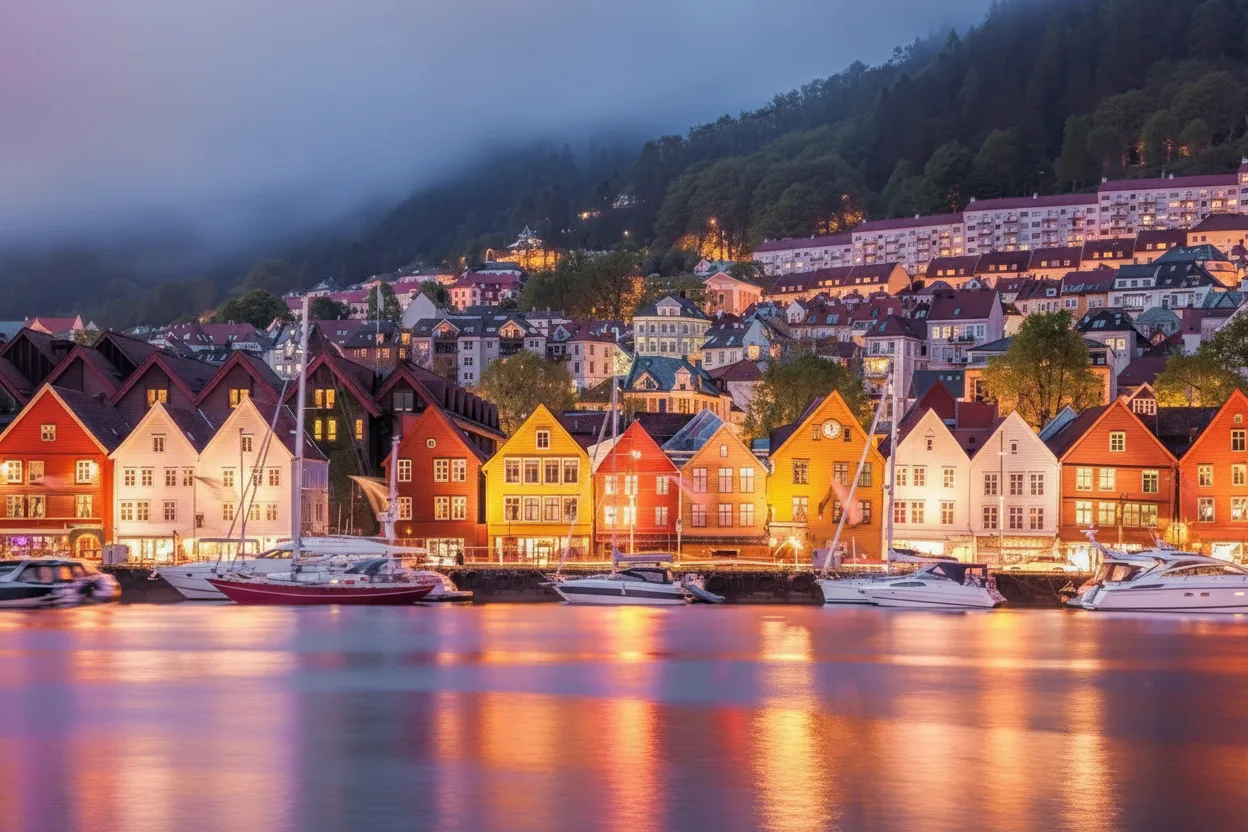 surrounding hills. The area connects Bryggen Wharf, the Fish Market, and Bergenhus Fortress,