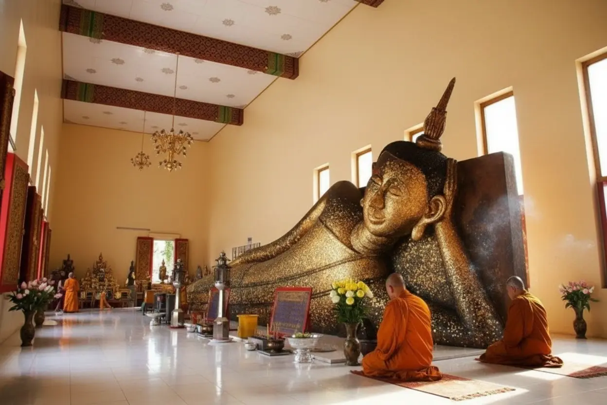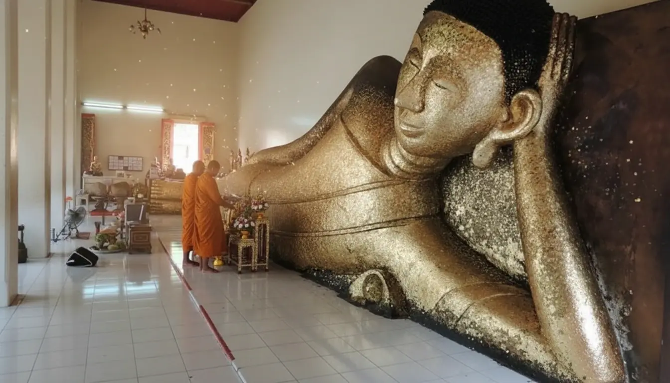 • 8:15 AM – Offer incense 🔥 and flowers 🌸 at the reclining Buddha 🧘‍♂️🙏✨