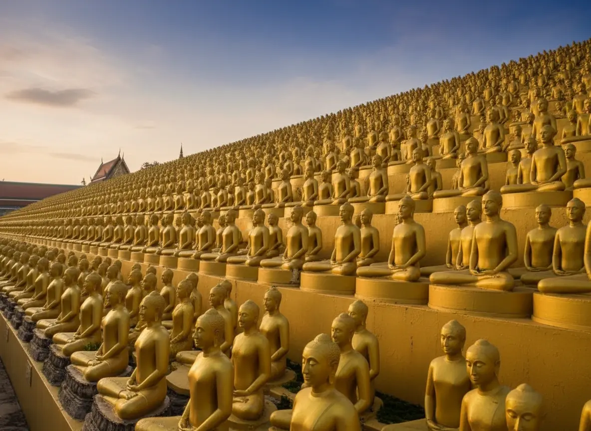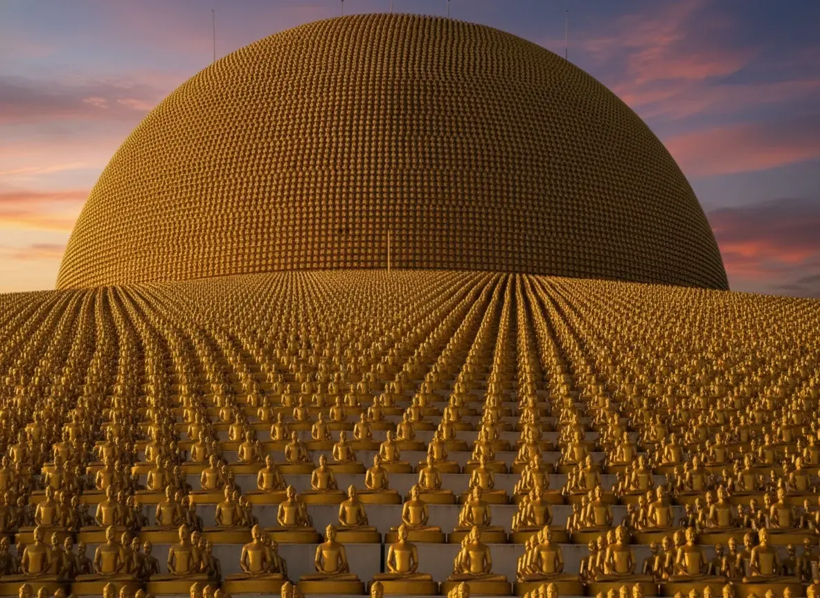 • Admire the iconic golden dome 🟡 (Dhammakaya Cetiya) 🛕, symbolizing enlightenment 💡 and purity 🤍✨