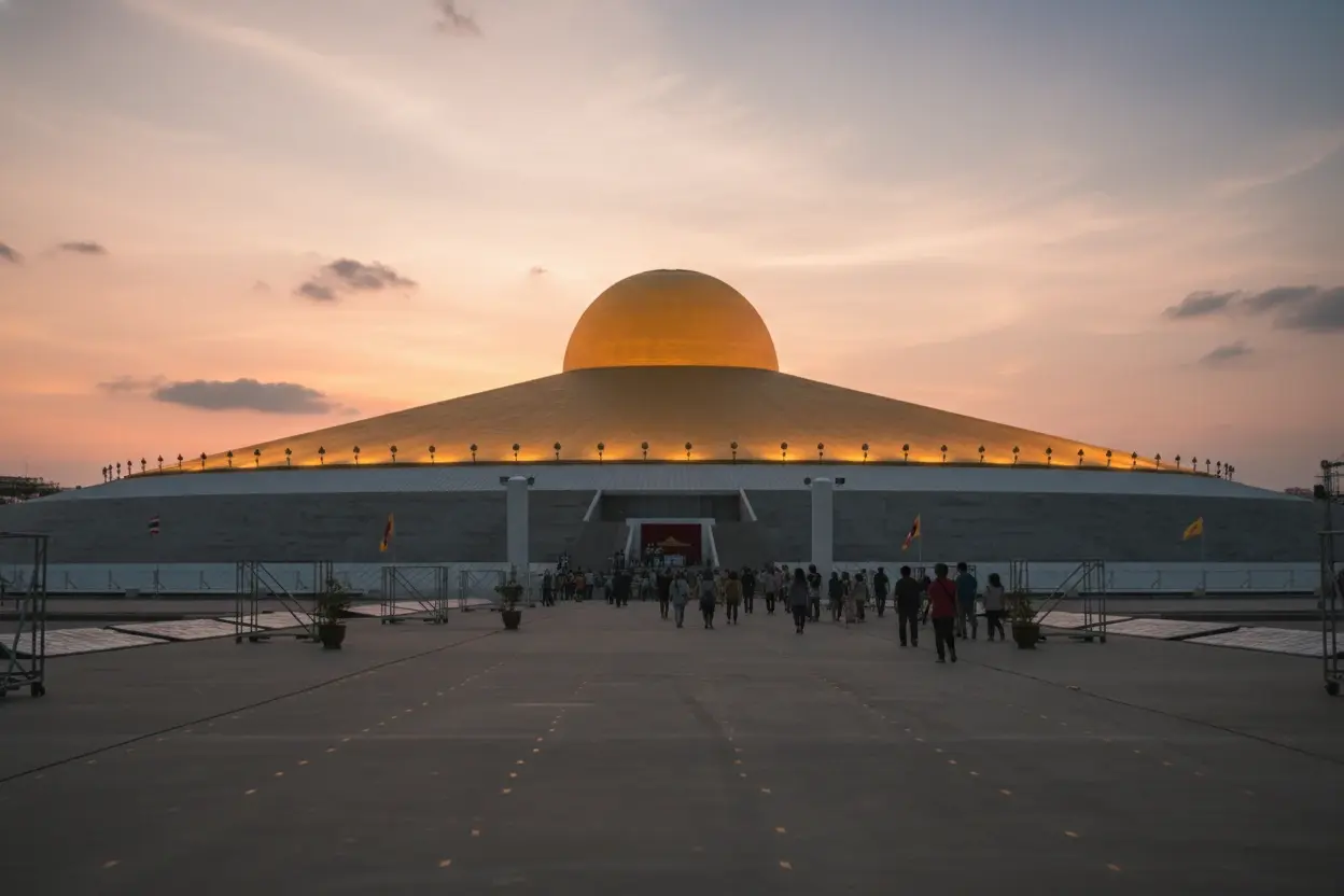 Wat Phra Dhammakaya, located in Khlong Luang, Pathum Thani, is one of Thailand’s most modern and visually striking temples. Known for its futuristic golden dome, this temple serves as the headquarters of the Dhammakaya Foundation, which promotes meditation and world peace. Its vast open-air prayer ground can accommodate over a million people during major Buddhist ceremonies, making it one of the most impressive religious sites in Southeast Asia.