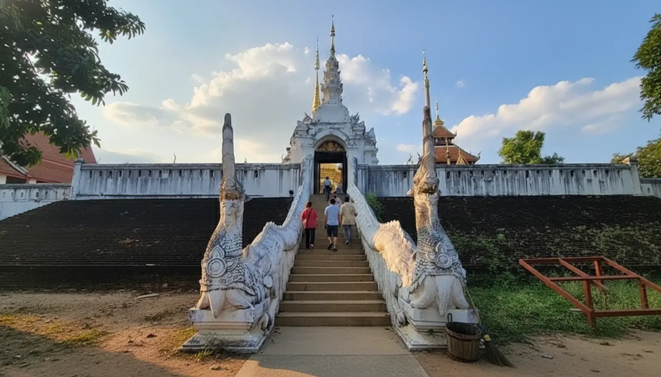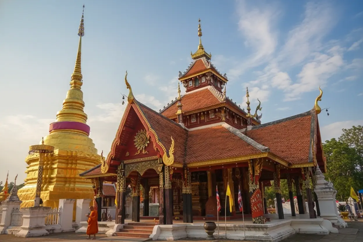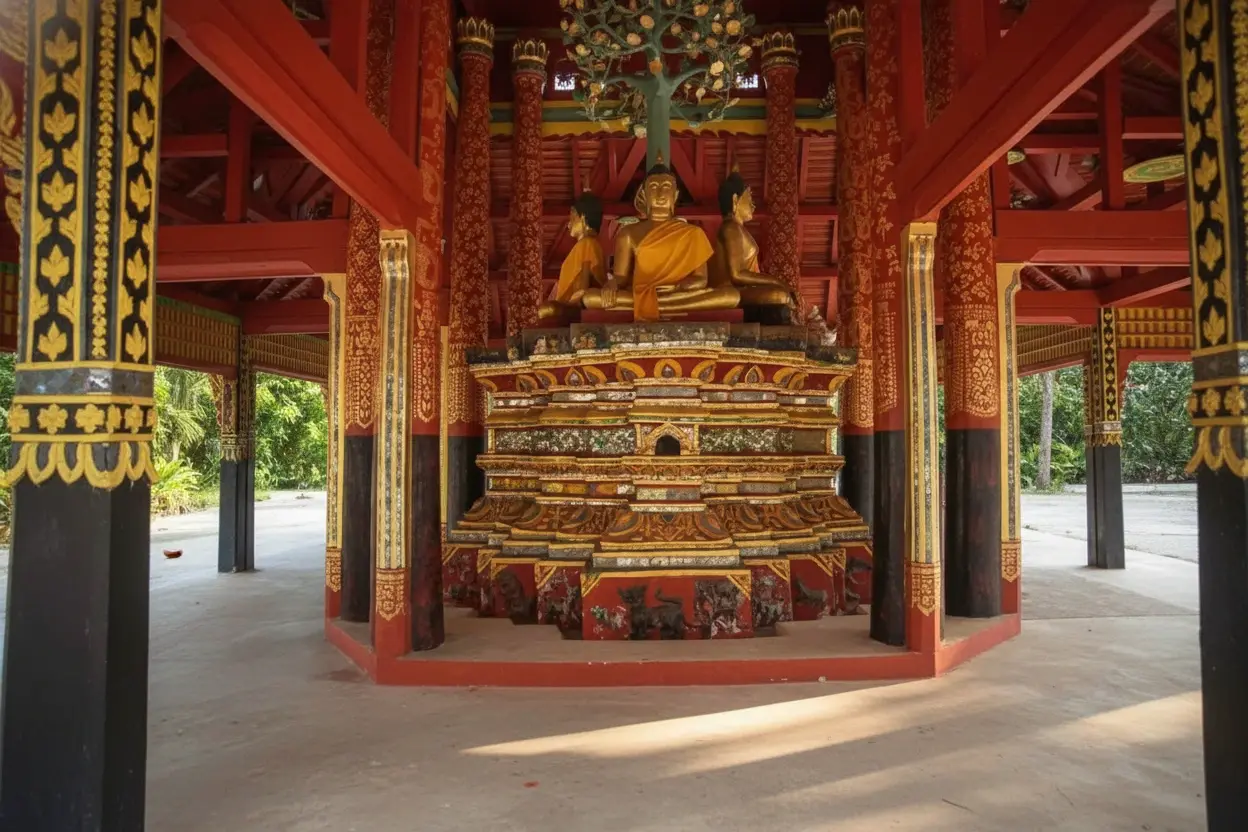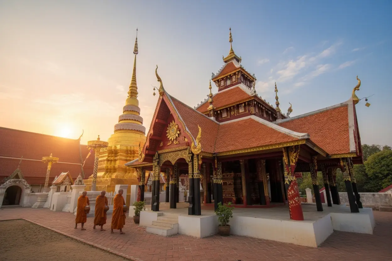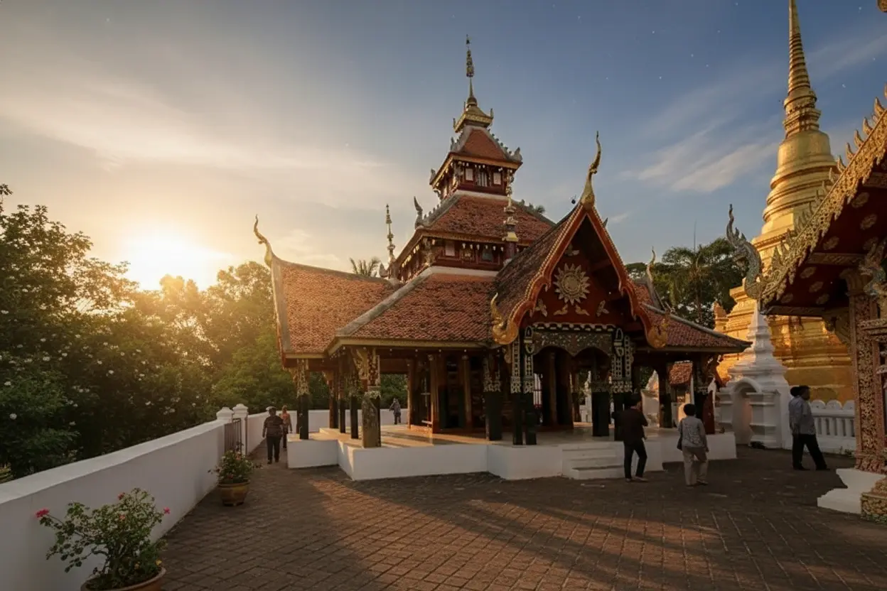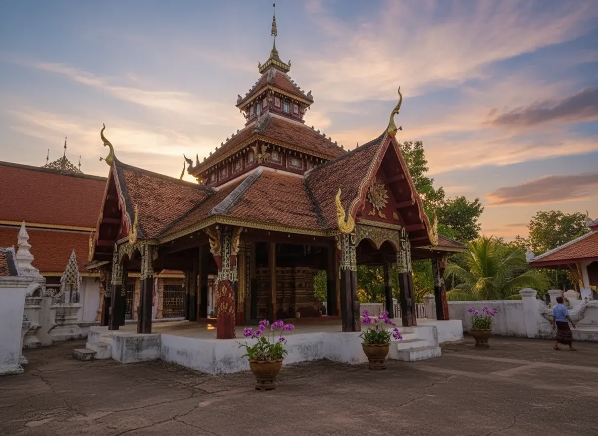 • 9:00 AM – Explore the main viharn ⛪ and admire the wooden details 🪵✨👀