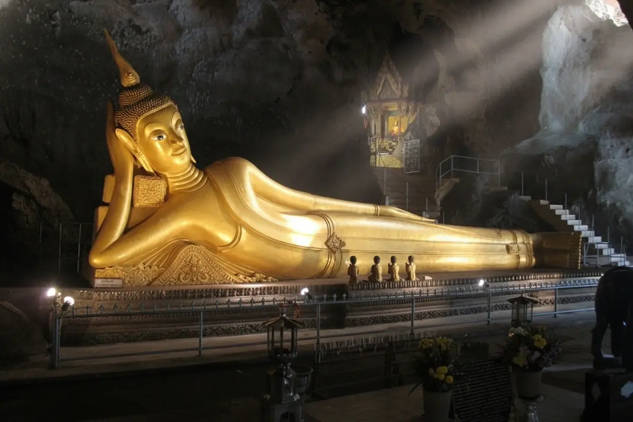• Reclining Buddha 🙏: a 15-meter 📏 golden statue 💛 lying peacefully 😌 inside the main cave 🦇✨