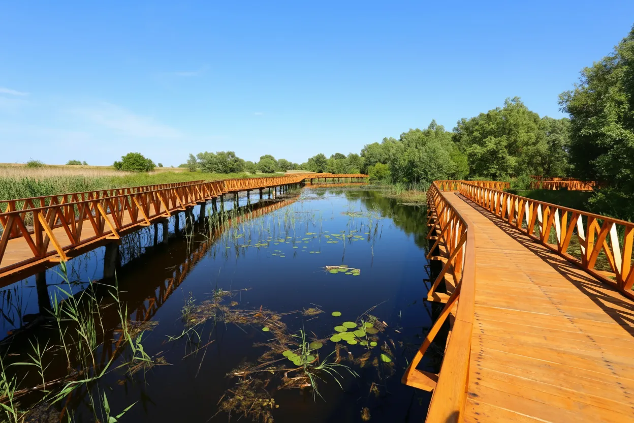The wooden boardwalks in Kopački Rit Nature Park allow visitors to walk safely through sensitive wetland areas. These raised paths pass over marshland, shallow water, and reed beds, offering close contact with the natural environment. Walking along the boardwalks provides a quiet and immersive experience. The gentle sounds of water, birds, and wind through reeds create a calm atmosphere throughout the walk. For travelers, the wooden boardwalks offer an easy and accessible way to explore wetlands without disturbing wildlife.