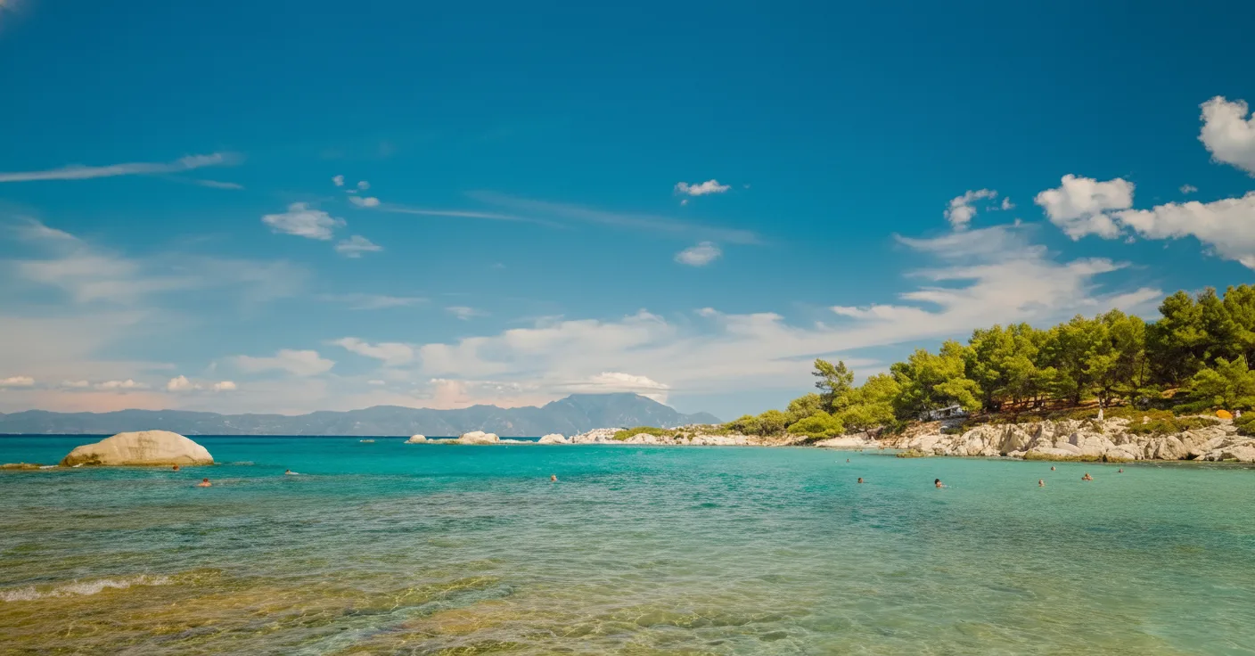 The wide beach layout allows space to enjoy the sea, while surrounding hills create an open island